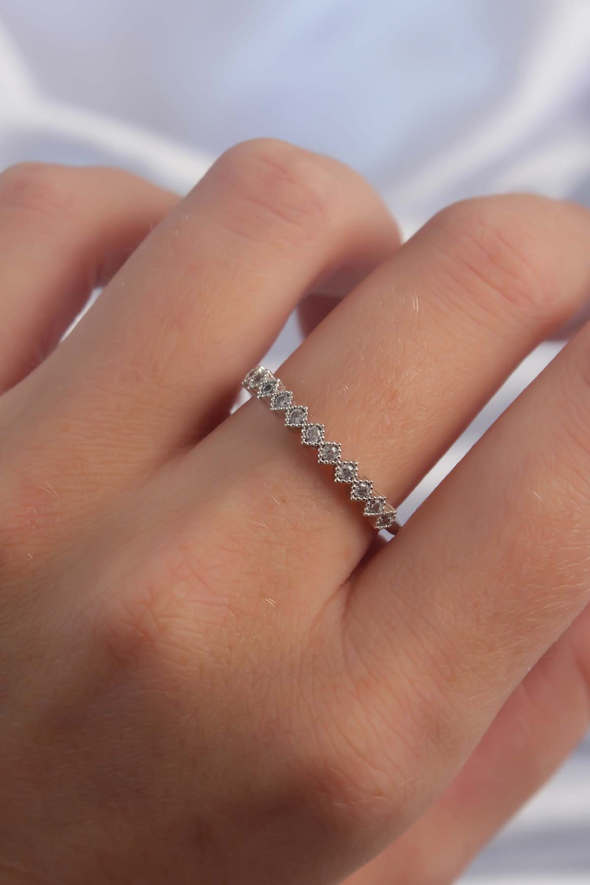 Pirinç Gümüş Renk Minimal Sıralı Zirkon Taşlı Ayarlanabilir Yüzük - TJ-BYK3292