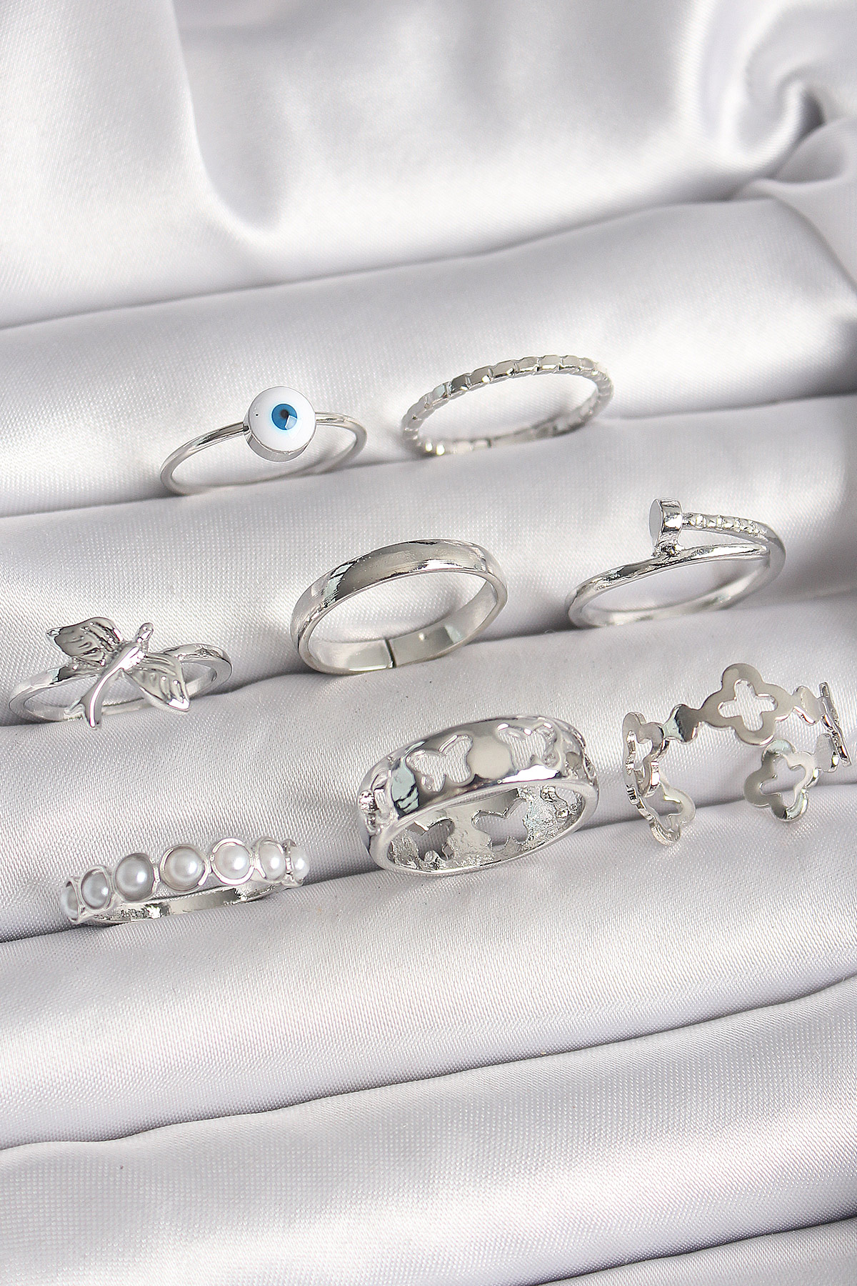 Pirinç Gümüş Renk Nazar Boncuk Detay İncili Kelebek İşlemeli Kadın Yüzük Kombini - TJ-BYK3649