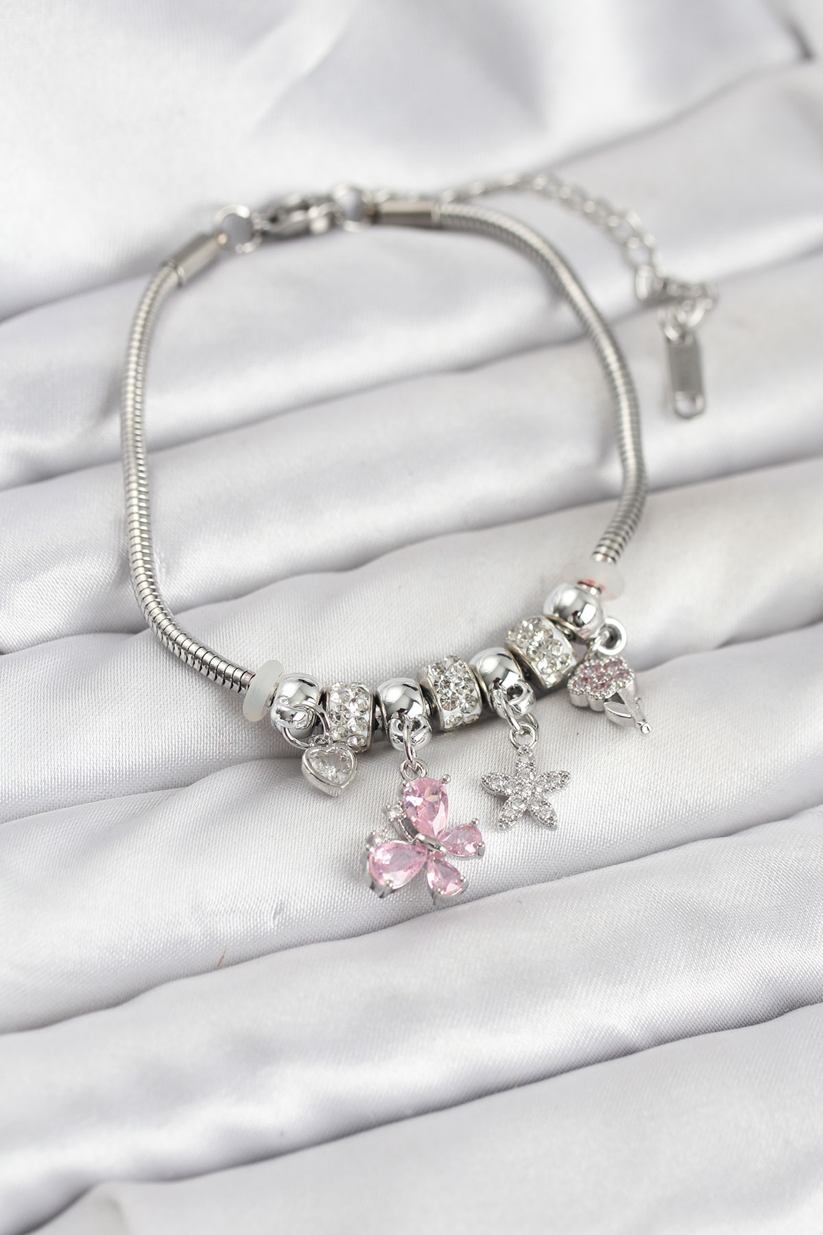 Pirinç Gümüş Renk Pembe Kelebek Charmlı Kadın Bileklik - TJ-BB8204