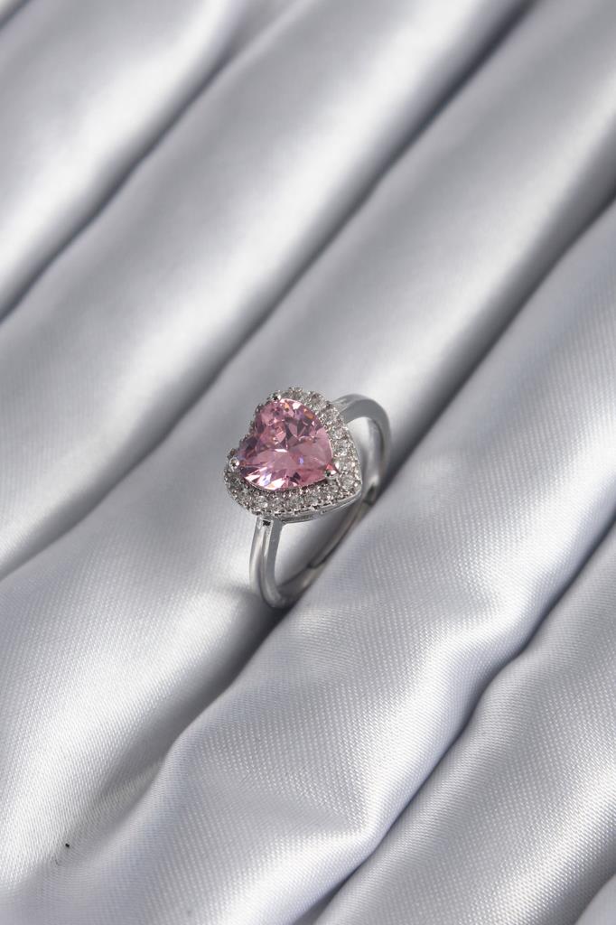 Pirinç Gümüş Renk Pembe Zirkon Taş Kalp Charm Model Kadın Yüzük - TJ-BYK2954