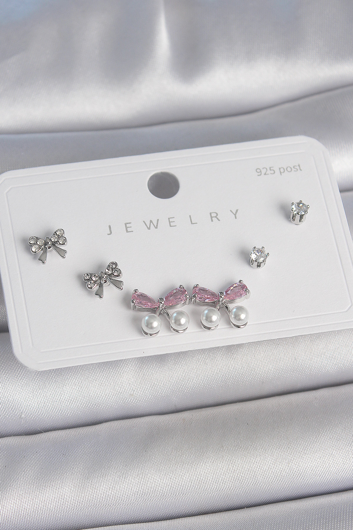 Pirinç Gümüş Renk Pembe Zirkon Taşlı Kurdele Model İnci Detay 925 Ayar Gümüş Çivi Kadın Küpe Seti - TJ-BKP10485