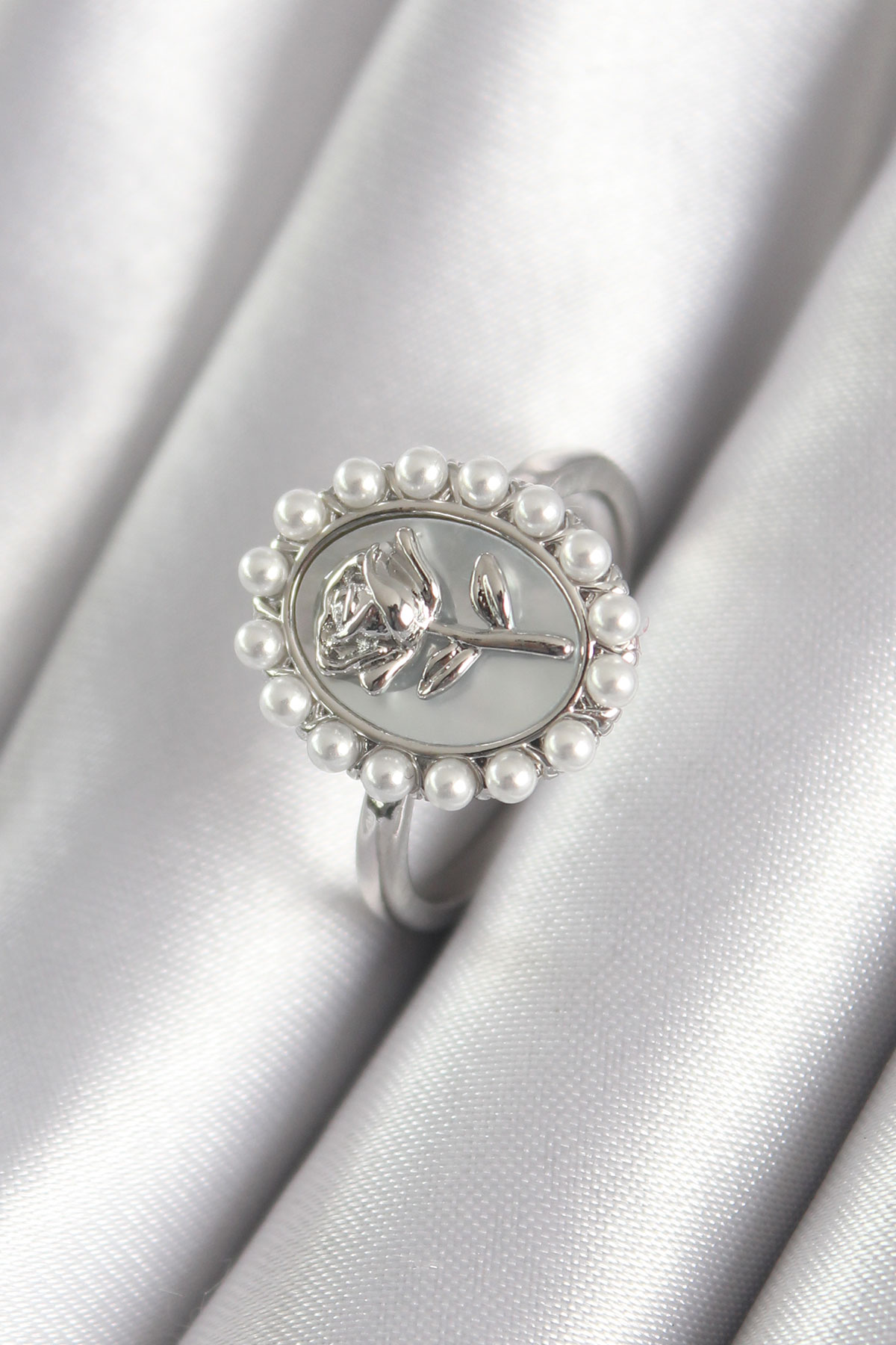 Pirinç Gümüş Renk Portre Gül Model İnci Detay Kadın Yüzük - TJ-BYK3064