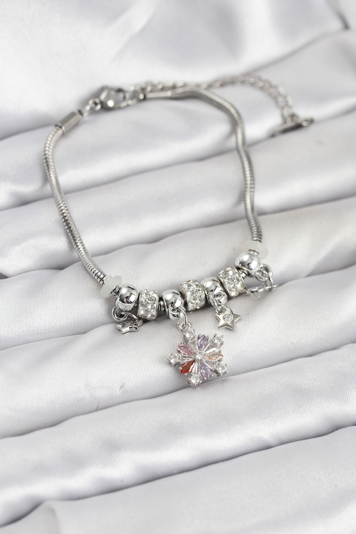 Pirinç Gümüş Renk Renkli Yıldız Charmlı Kadın Bileklik - TJ-BB8186
