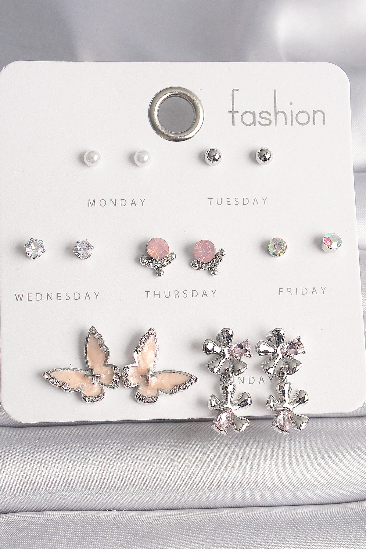Pirinç Gümüş Renk Renkli Zirkon Taş Detaylı Pembe Sedefli Kelebek Figür 7 Çift Kadın Küpe Seti - TJ-BKP10188
