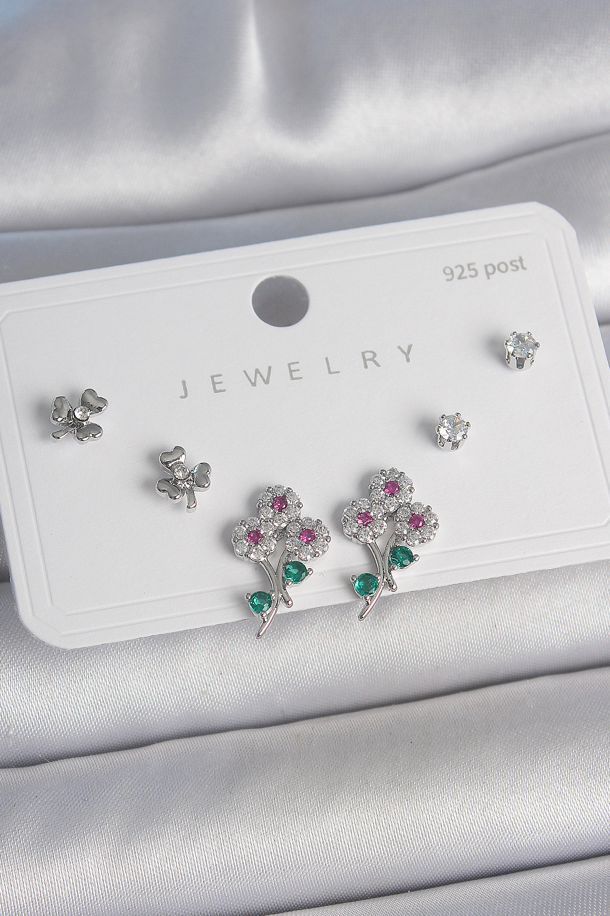 Pirinç Gümüş Renk Renkli Zirkon Taşlı Çiçek Model Yaprak Detay 925 Ayar Gümüş Çivi Kadın Küpe Seti - TJ-BKP10487