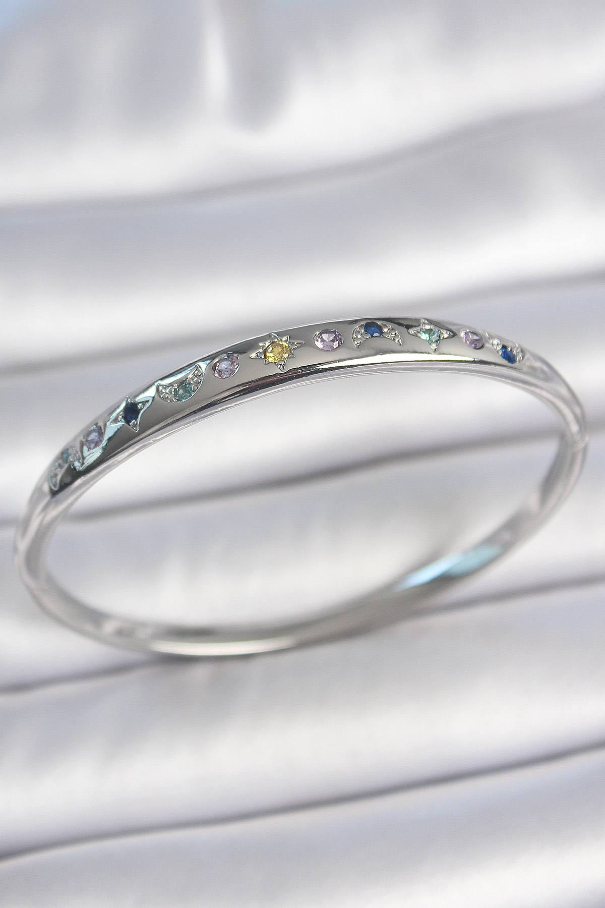 Pirinç Gümüş Renk Renkli Zirkon Taşlı Hilal Yıldız İşlemeli Kadın Kelepçe - TJ-BB6944