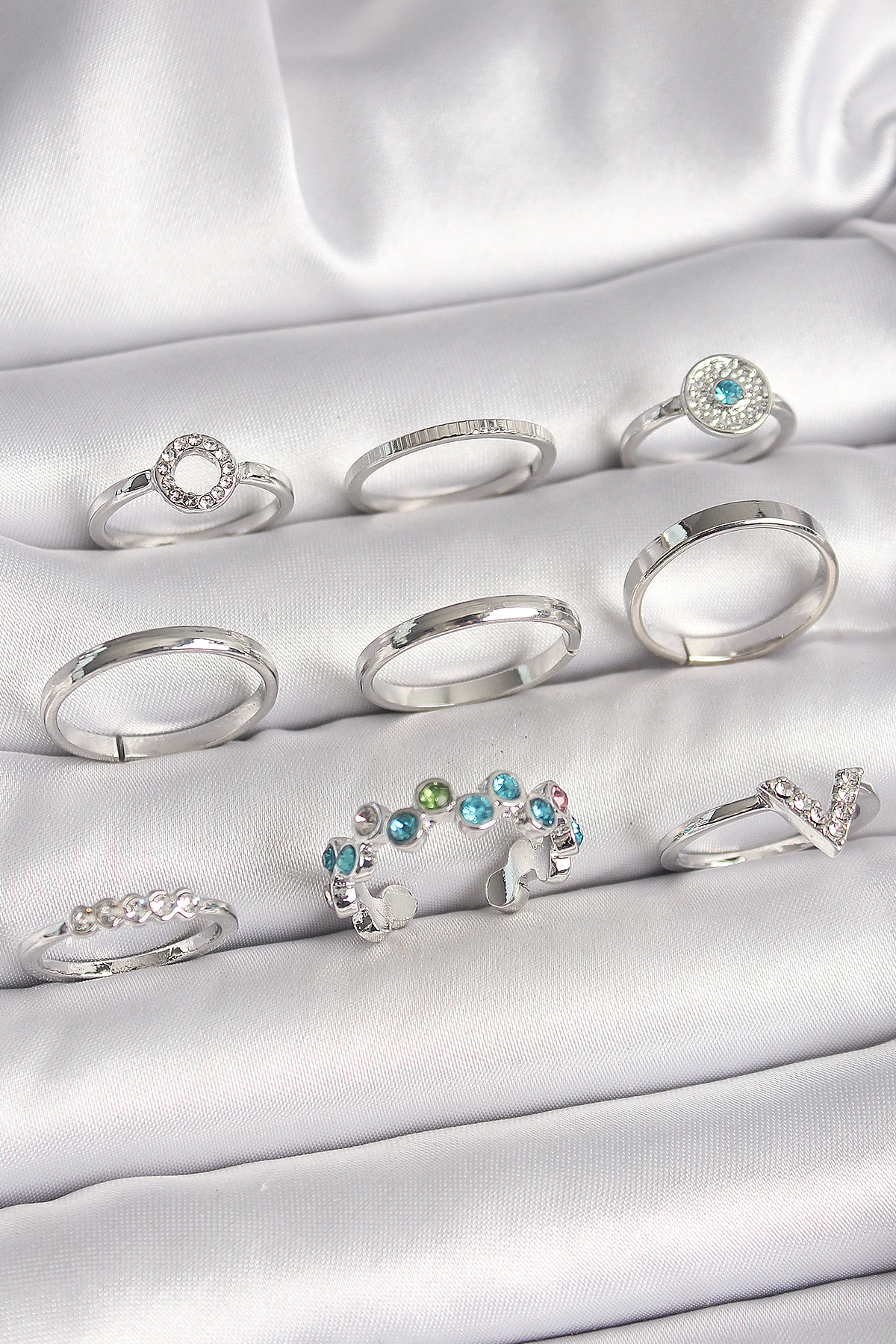 Pirinç Gümüş Renk Renkli Zirkon Taşlı Kadın Yüzük Kombini - TJ-BYK3654