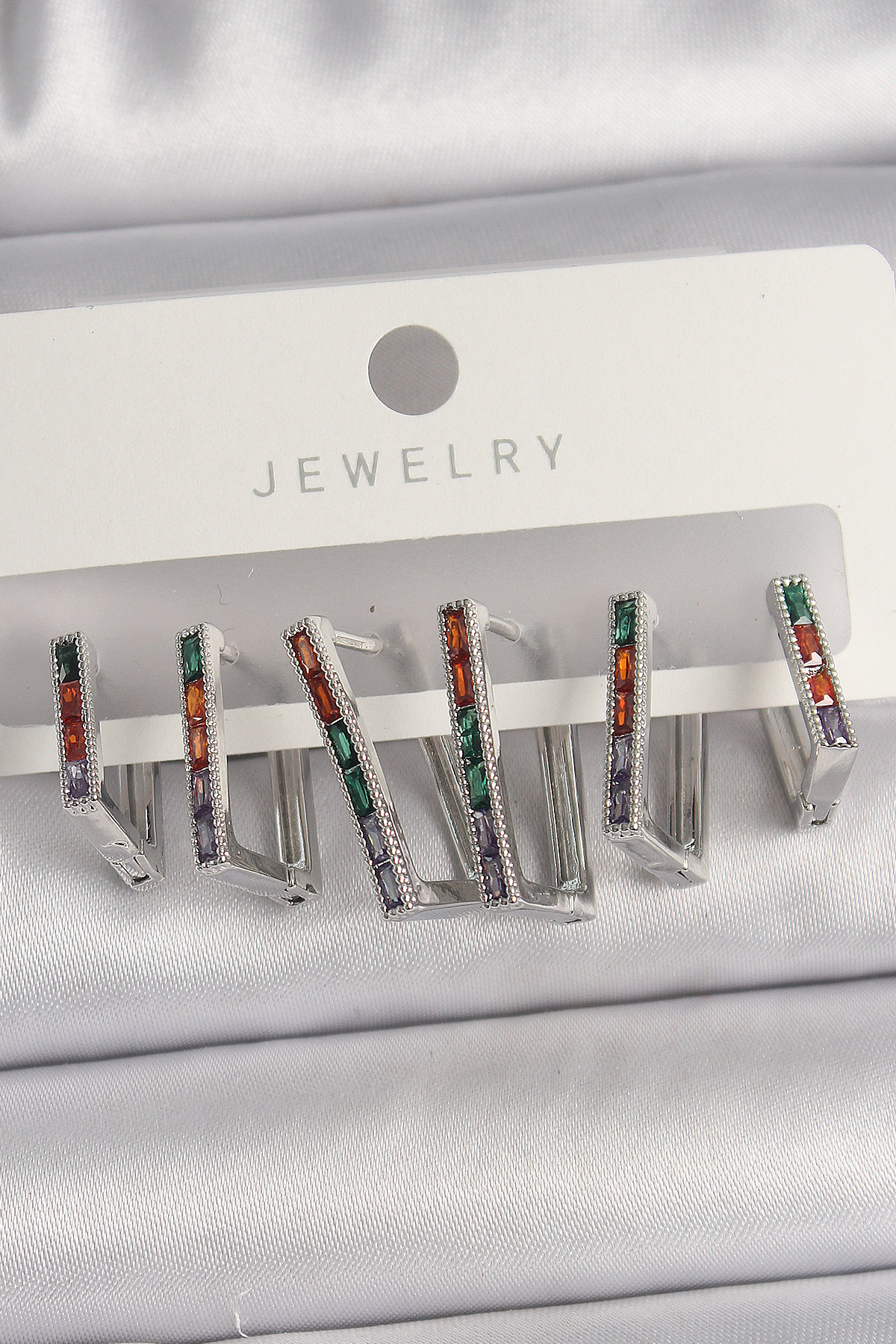 Pirinç Gümüş Renk Renkli Zirkon Taşlı Kare Model Kadın Küpe Seti - TJ-BKP10107