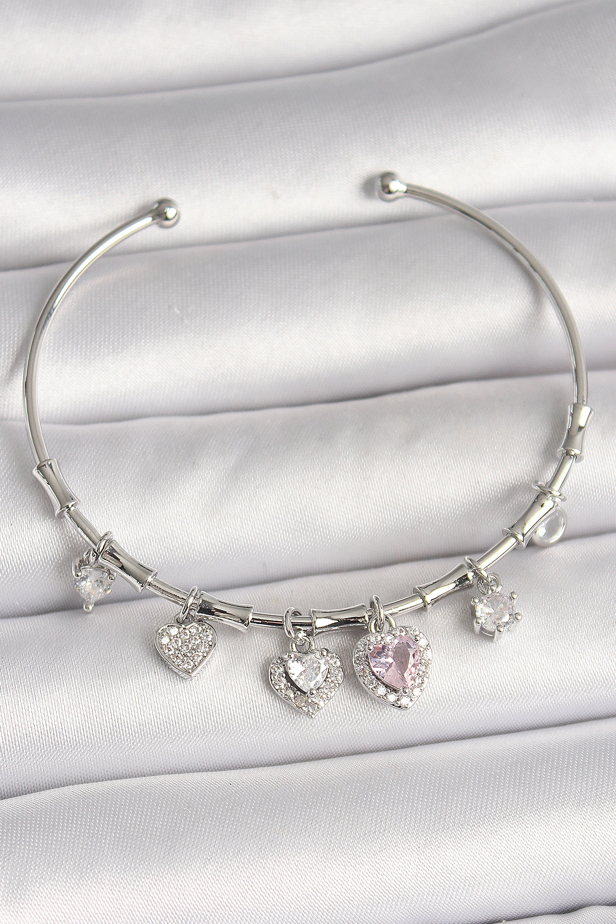 Pirinç Gümüş Renk Sallantı Pembe Zirkon Taşlı Kalp Model Charm Kadın Bileklik - TJ-BB6929