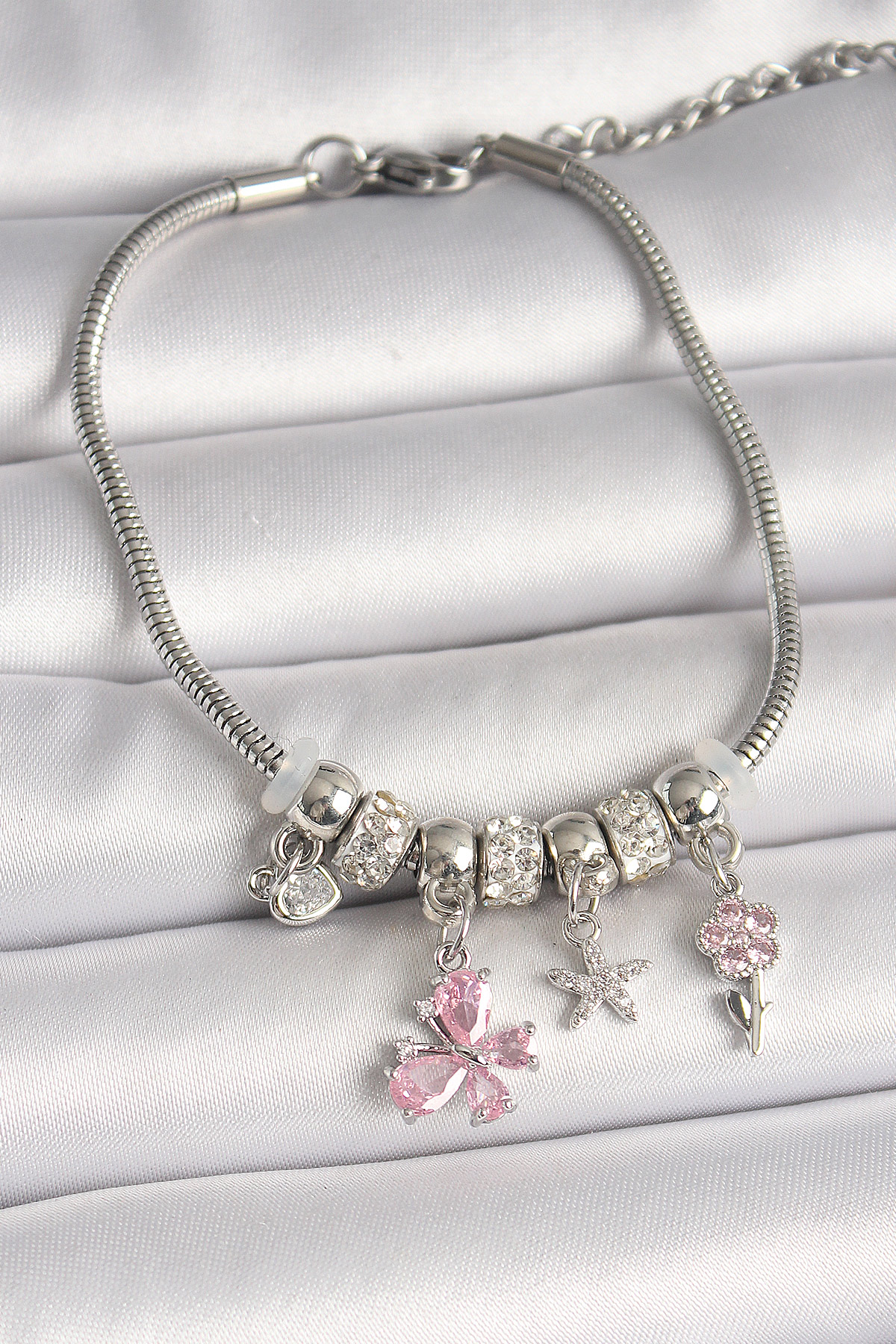 Pirinç Gümüş Renk Sallantı Pembe Zirkon Taşlı Kelebek Figür Çiçek Detay Charm Kadın Bileklik - TJ-BB6933