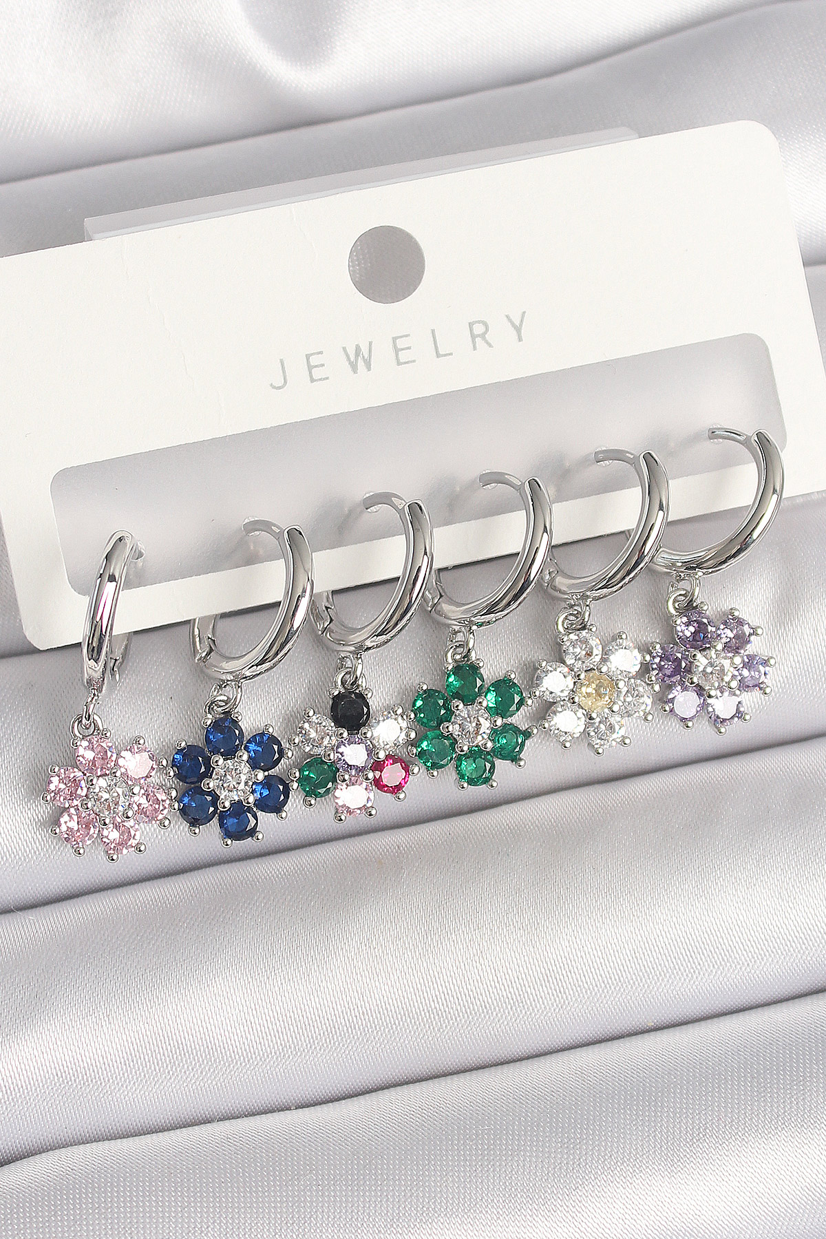 Pirinç Gümüş Renk Sallantı Renkli Zirkon Taşlı Çiçek Model Kadın Küpe Seti - TJ-BKP10370