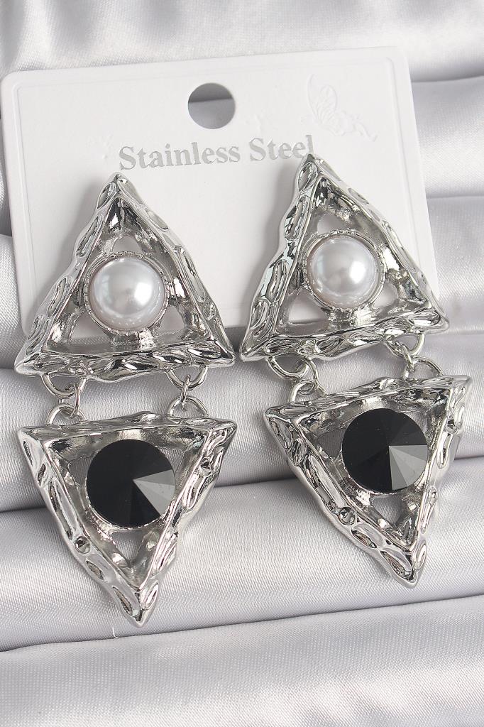 Pirinç Gümüş Renk Sallantı Üçgen Model İnci Detay Kadın Küpe - TJ-BKP10089