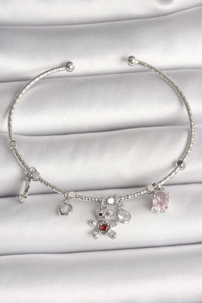 Pirinç Gümüş Renk Sallantı Zirkon Taşlı Ayıcık Figür Kırmızı Taş Detay Charm Kadın Bileklik - BB6912