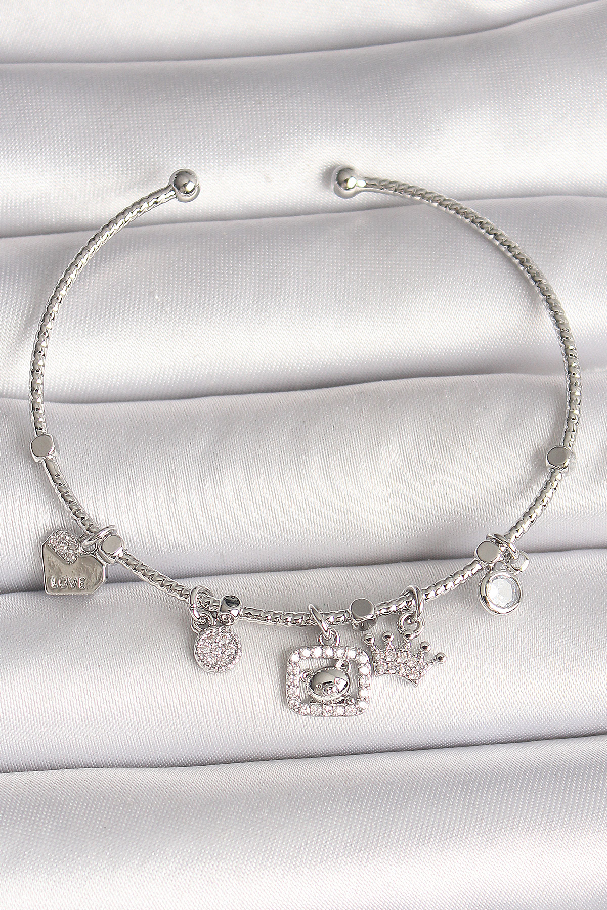 Pirinç Gümüş Renk Sallantı Zirkon Taşlı Ayıcık Figür Taç Detay Charm Kadın Bileklik - TJ-BB6907