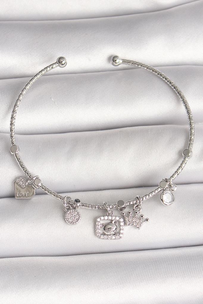 Pirinç Gümüş Renk Sallantı Zirkon Taşlı Ayıcık Figür Taç Detay Charm Kadın Bileklik - BB6907