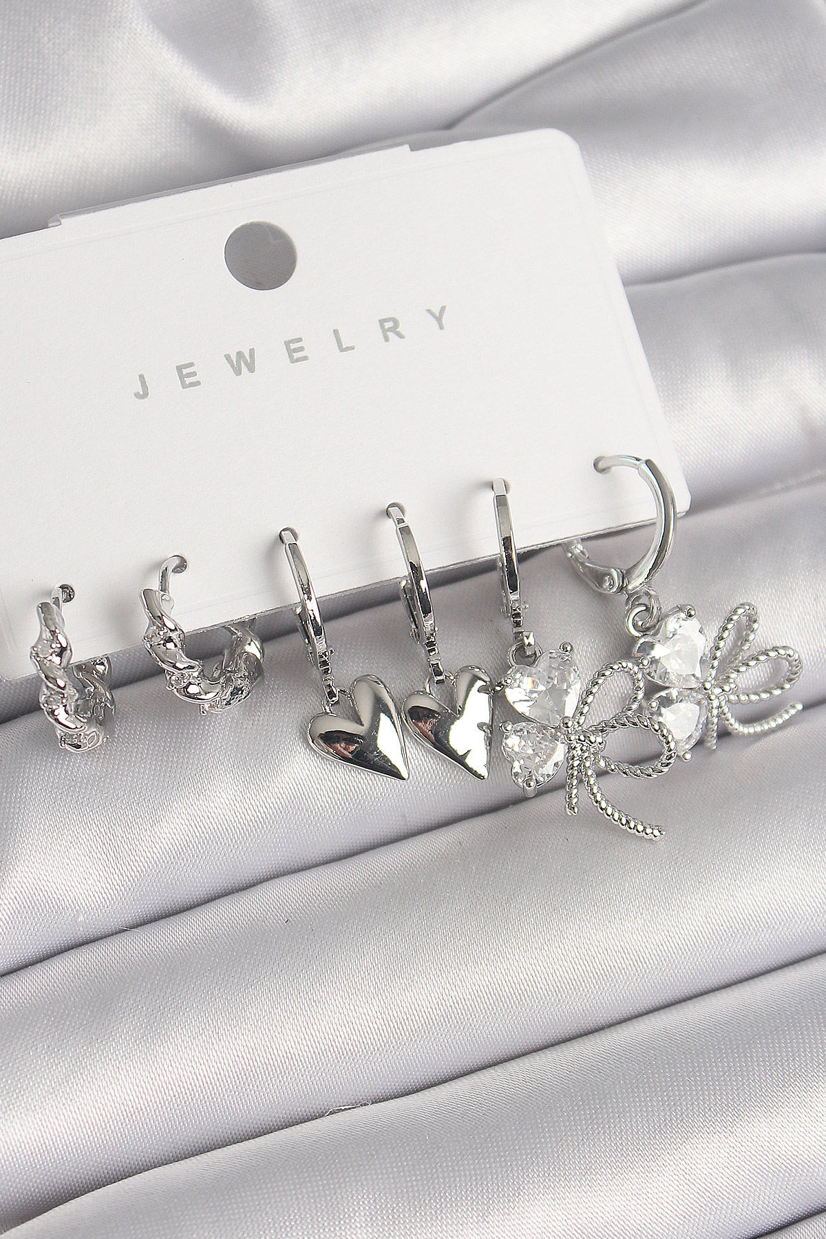 Pirinç Gümüş Renk Sallantı Zirkon Taşlı Düğüm Yonca Model Kalp Detay Kadın Küpe Seti - TJ-BKP10297