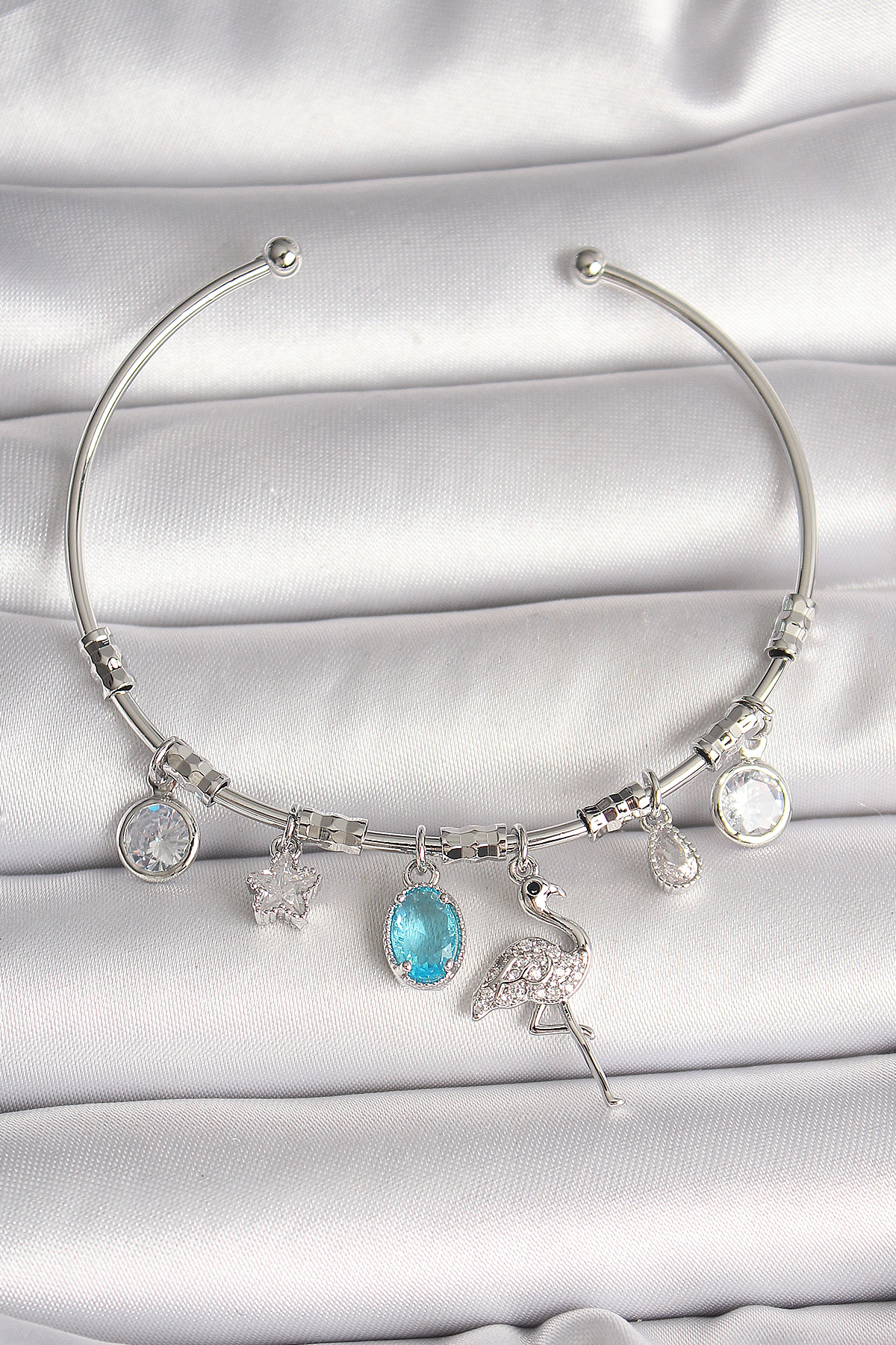 Pirinç Gümüş Renk Sallantı Zirkon Taşlı Filaminga Figür Charm Kadın Bileklik - TJ-BB6903