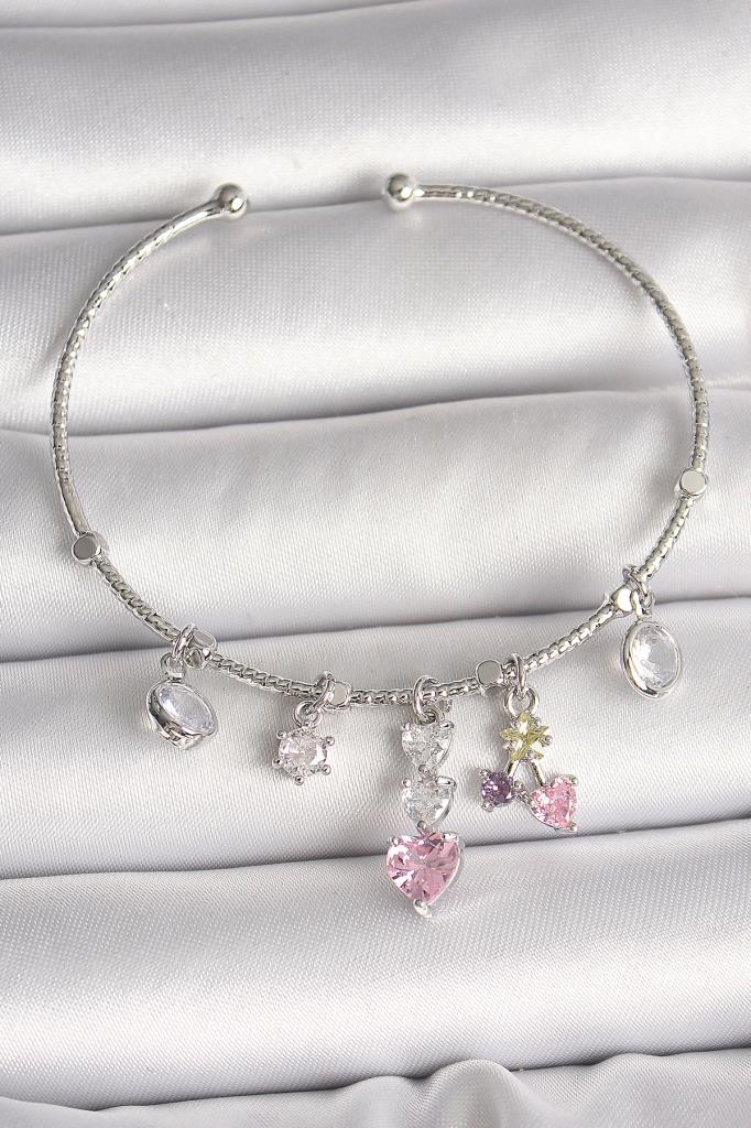 Pirinç Gümüş Renk Sallantı Zirkon Taşlı Kalp Figür Charm Kadın Bileklik - BB6910