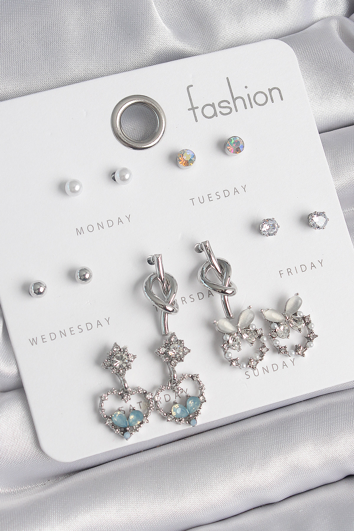 Pirinç Gümüş Renk Sallantı Zirkon Taşlı Kalp Model Düğüm Detay 7 Çift Kadın Küpe Seti - TJ-BKP10548