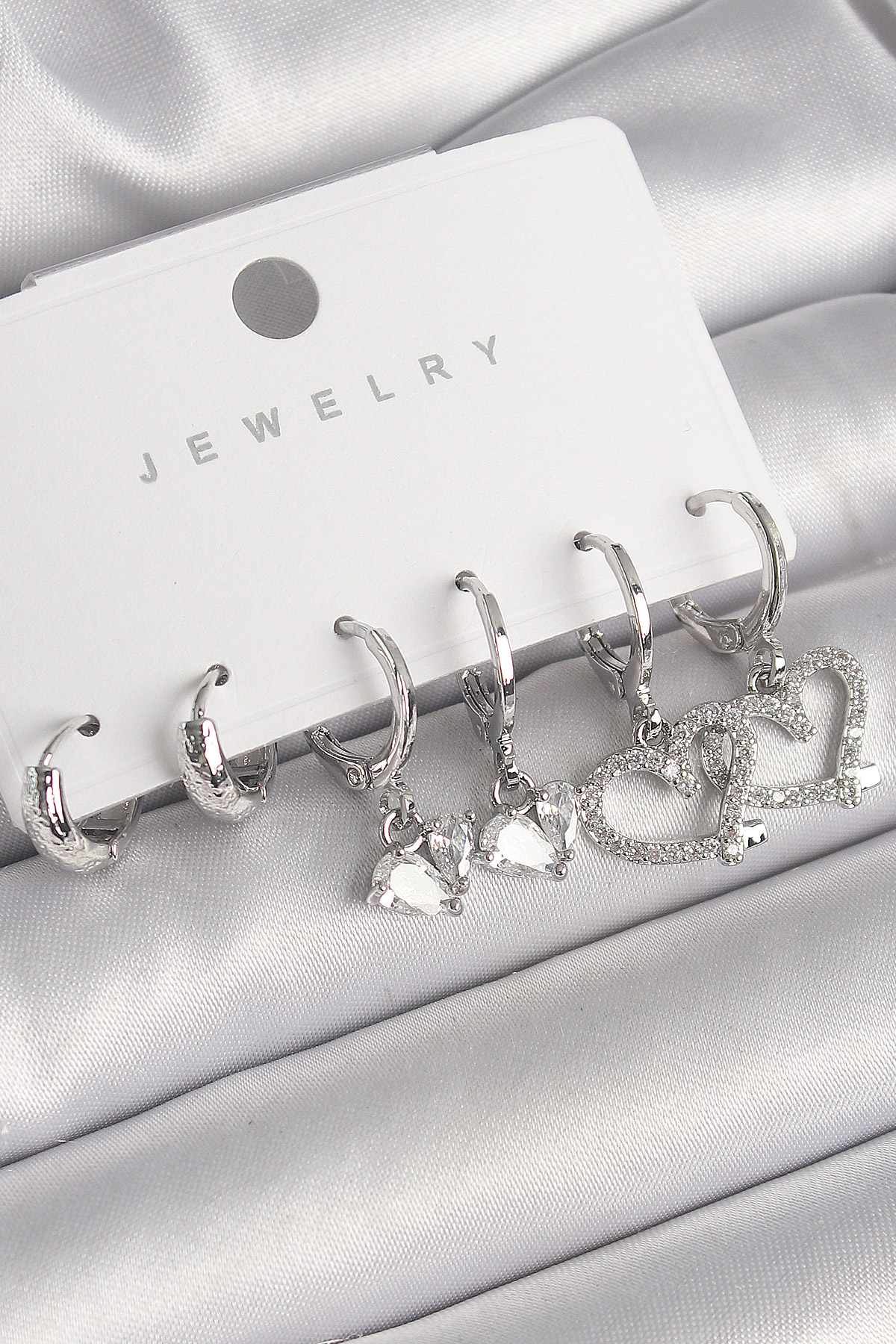 Pirinç Gümüş Renk Sallantı Zirkon Taşlı Kalp Model Halka Detay Kadın Küpe Seti - TJ-BKP10277