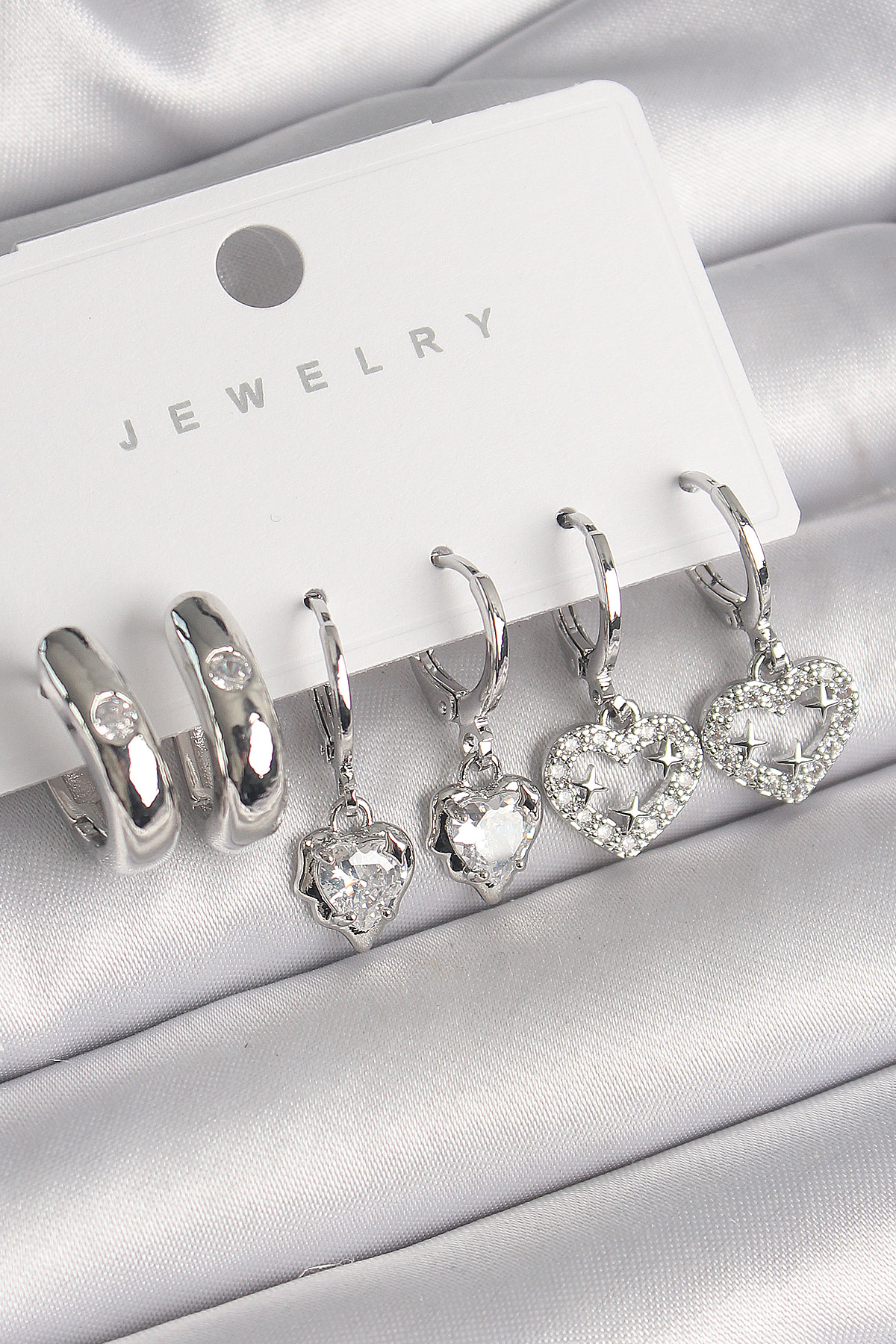 Pirinç Gümüş Renk Sallantı Zirkon Taşlı Kalp Model Halka Detay Kadın Küpe Seti - TJ-BKP10281