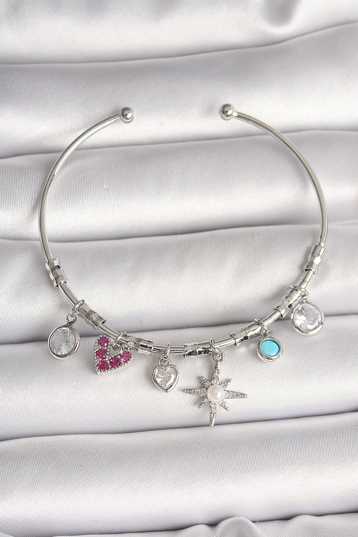 Pirinç Gümüş Renk Sallantı Zirkon Taşlı Kutup Yıldız Figür Kalp Detay Charm Kadın Bileklik - TJ-BB6898