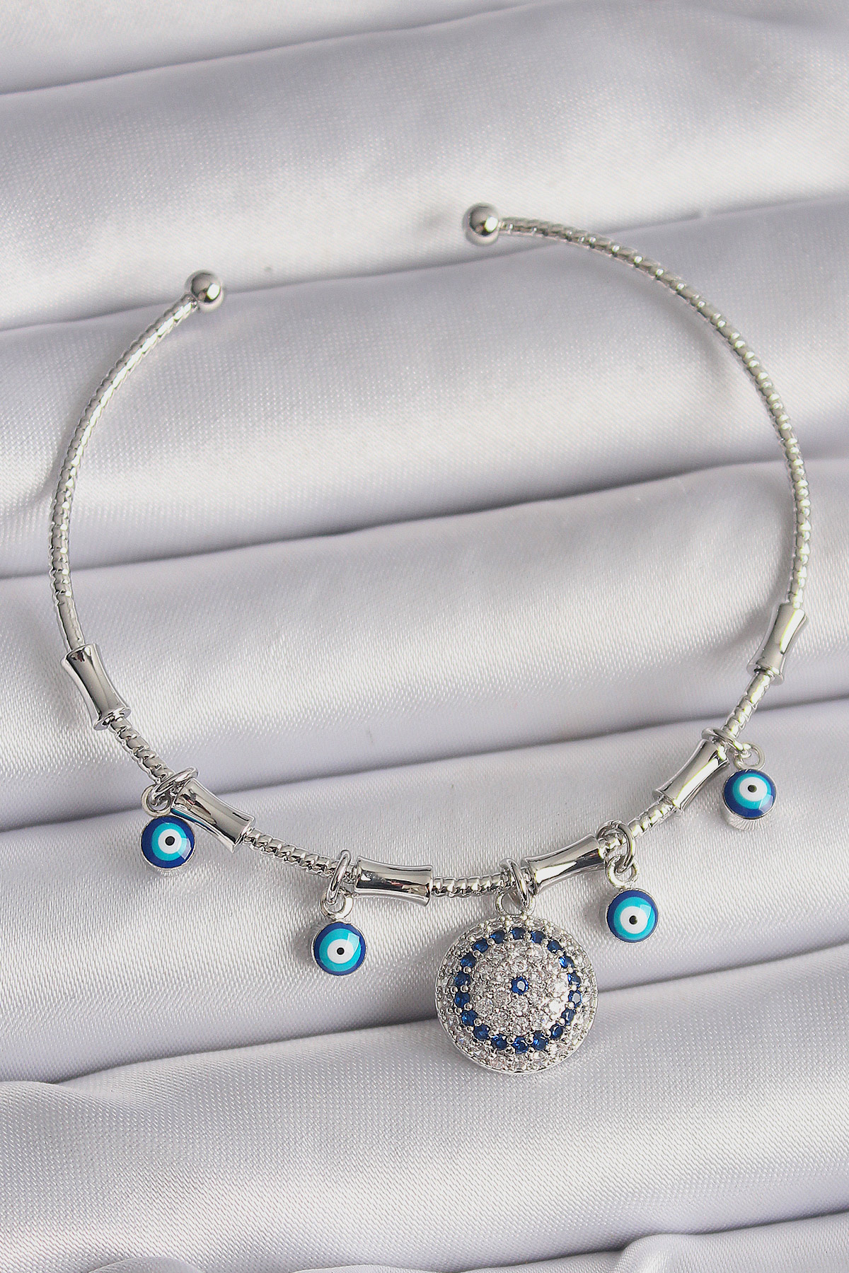 Pirinç Gümüş Renk Sallantı Zirkon Taşlı Nazar Boncuk Figür Charm Bileklik - TJ-BB6558