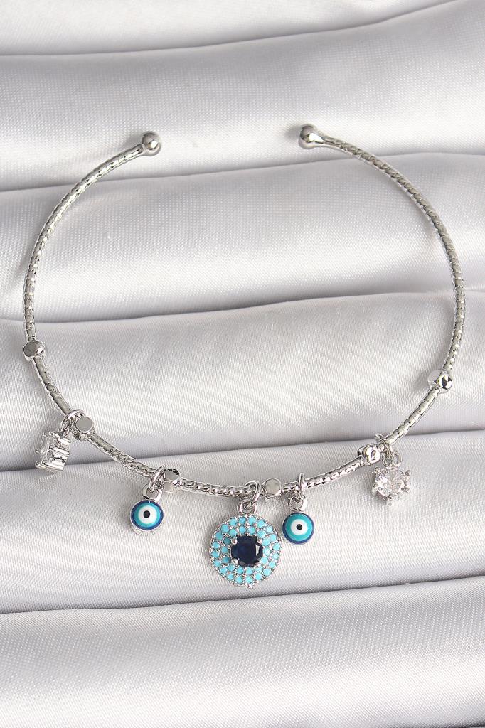 Pirinç Gümüş Renk Sallantı Zirkon Taşlı Nazar Boncuk Figür Charm Kadın Bileklik - BB6911