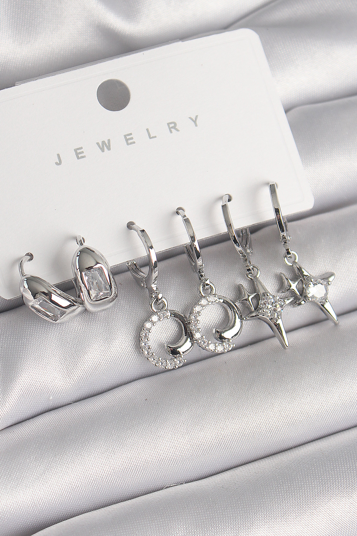 Pirinç Gümüş Renk Sallantı Zirkon Taşlı Yıldız Model Kadın Küpe Seti - TJ-BKP10287