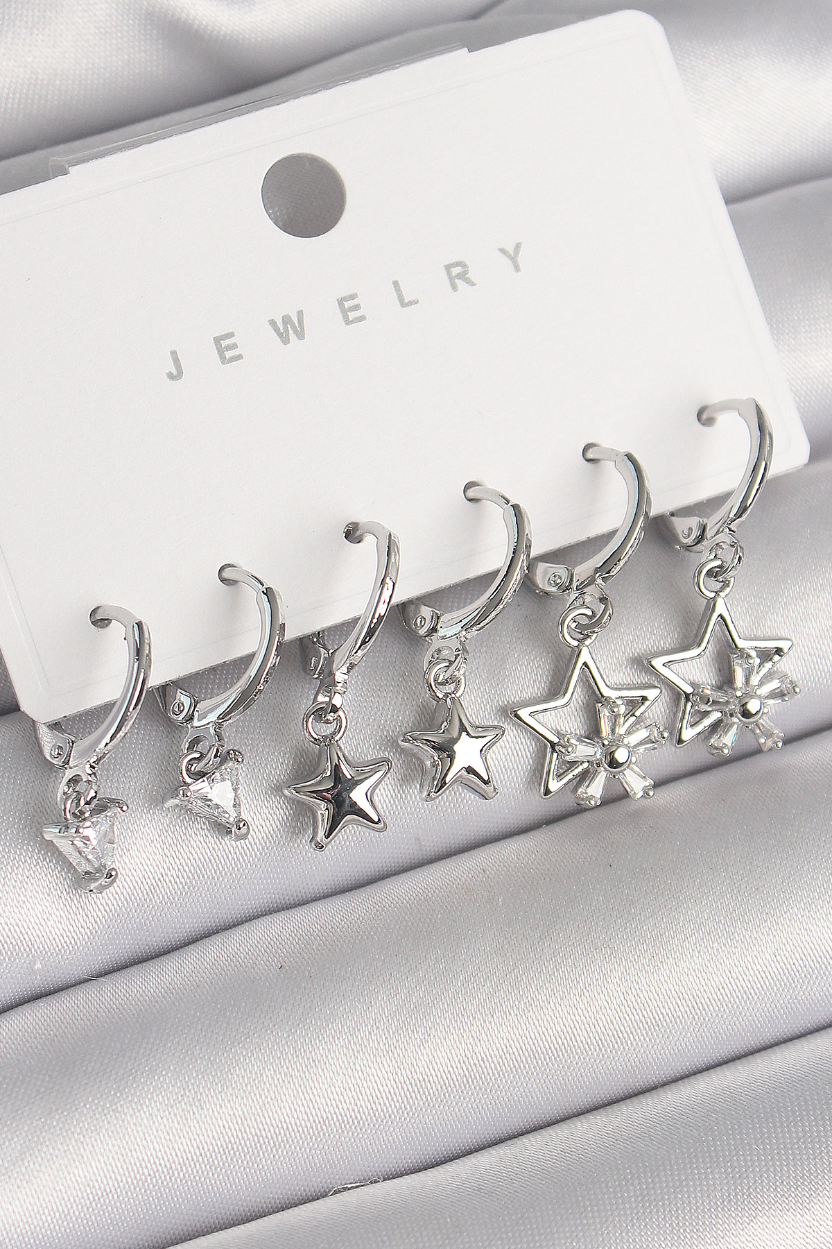 Pirinç Gümüş Renk Sallantı Zirkon Taşlı Yıldız Model Üçgen Detay Kadın Küpe Seti - TJ-BKP10289