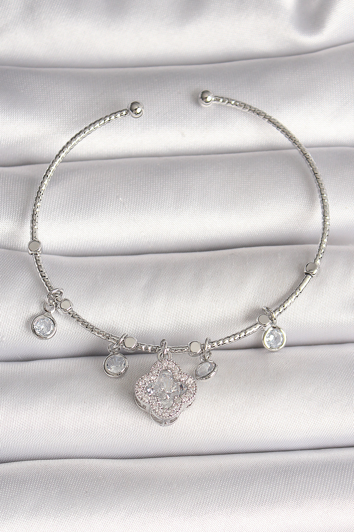 Pirinç Gümüş Renk Sallantı Zirkon Taşlı Yonca Figür Charm Kadın Bileklik - TJ-BB6905