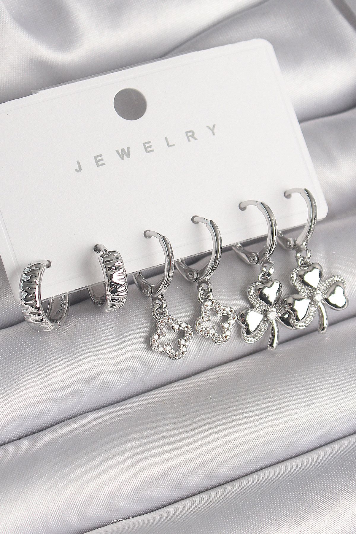 Pirinç Gümüş Renk Sallantı Zirkon Taşlı Yonca Model Kadın Küpe Seti - TJ-BKP10267