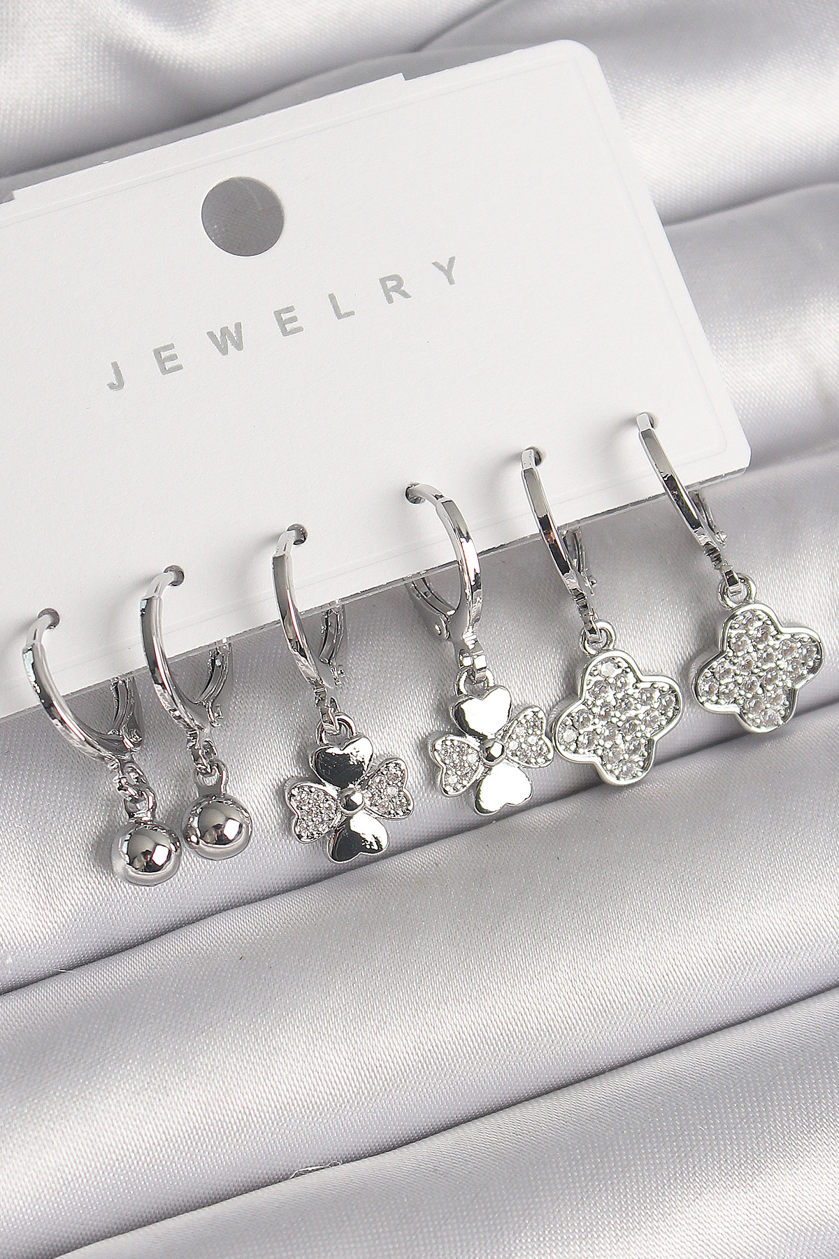 Pirinç Gümüş Renk Sallantı Zirkon Taşlı Yonca Model Topçuk Detay Kadın Küpe Seti - TJ-BKP10283