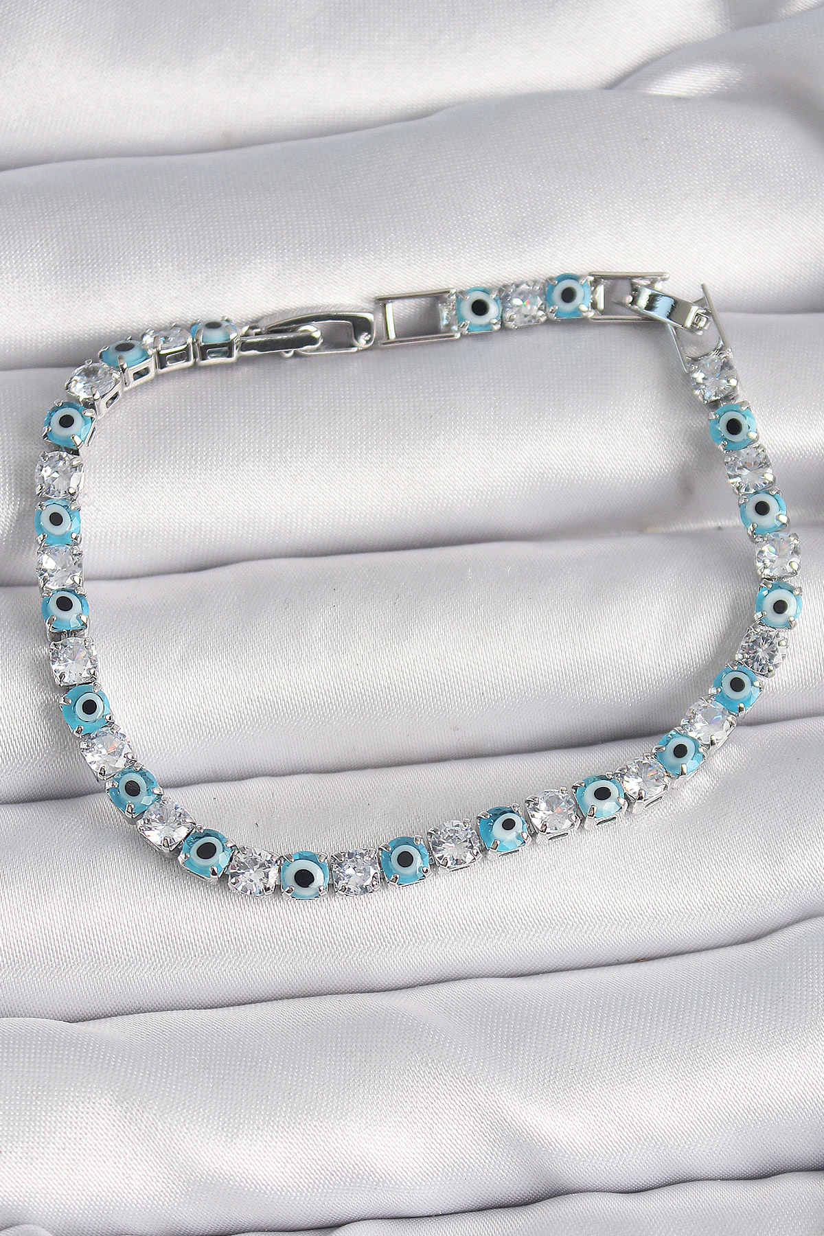 Pirinç Gümüş Renk Su Yolu Zirkon Taşlı Nazar Boncuklu Kadın Bileklik - TJ-BB6647