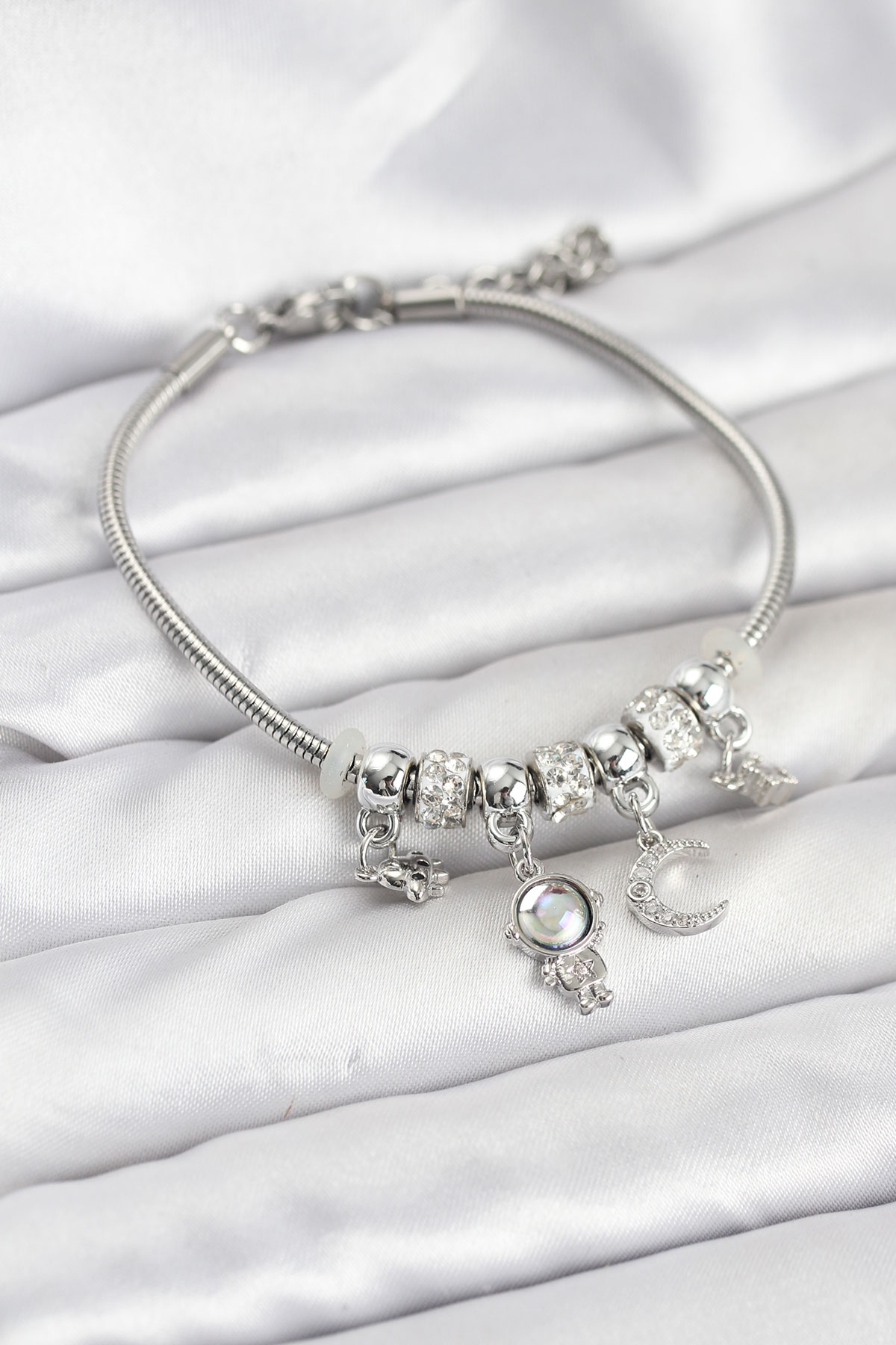 Pirinç Gümüş Renk Uzay Tema Charmlı Kadın Bileklik - TJ-BB8178