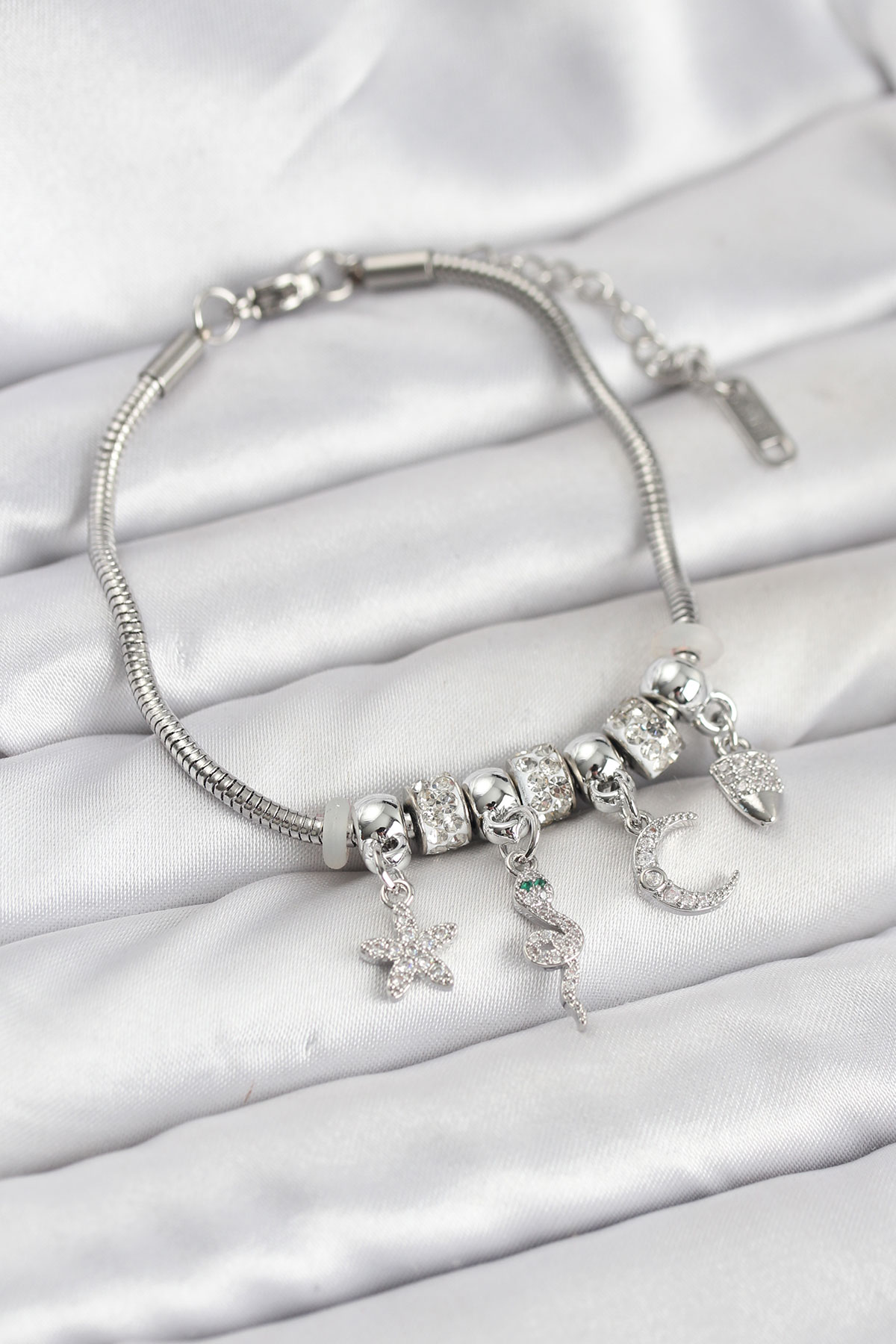 Pirinç Gümüş Renk Yılan Charmlı Kadın Bileklik - TJ-BB8182
