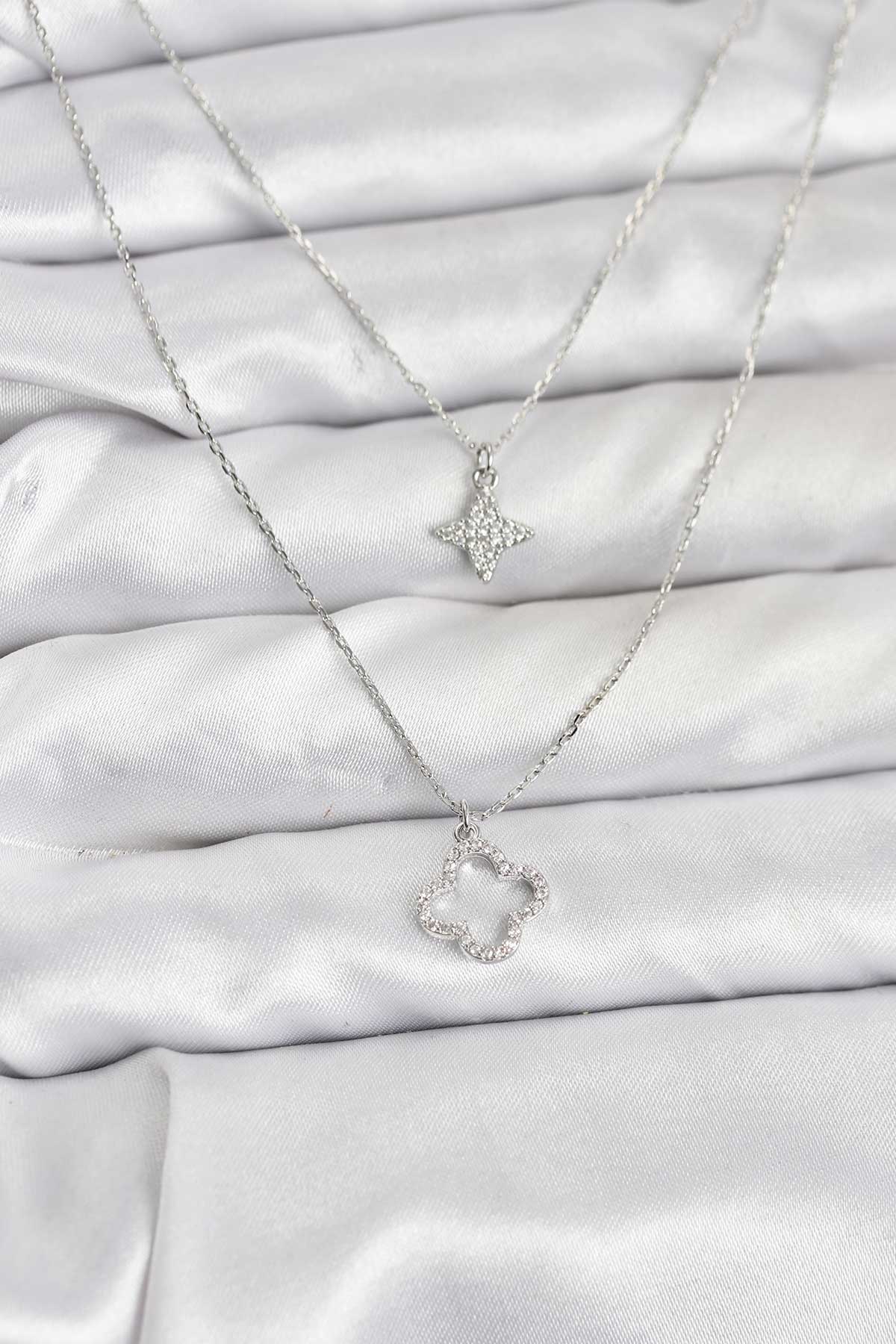 Pirinç Gümüş Renk Yonca Model 2'li Kadın Kolye - TJ-BKO10802