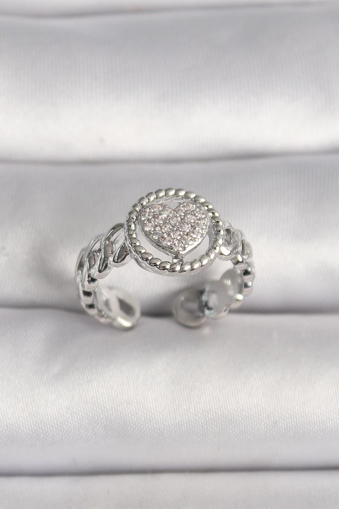 Pirinç Gümüş Renk Zincir Model Zirkon Taşlı Kalp Model Kadın Yüzük - TJ-BYK3587