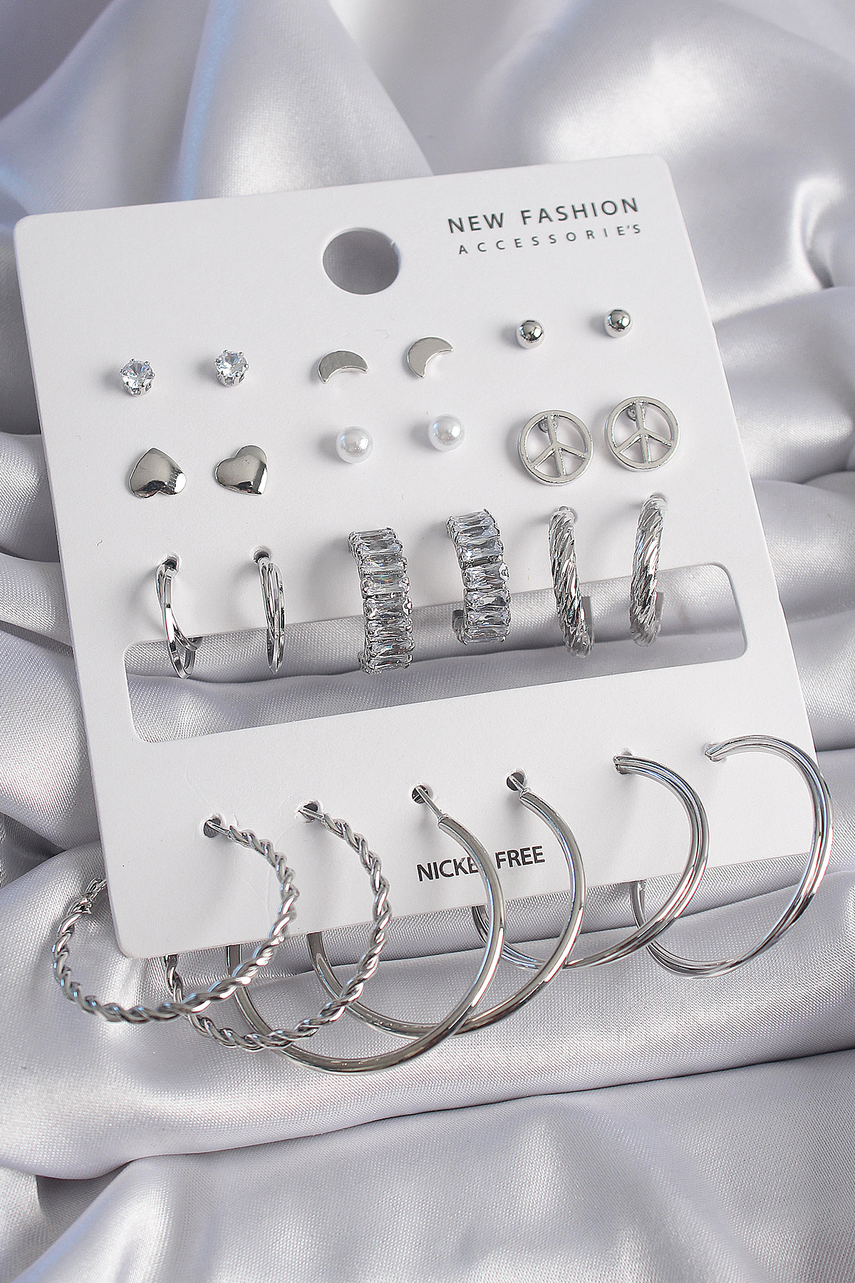 Pirinç Gümüş Renk Zirkon Taş Detaylı 12 Çift Kadın Küpe Seti - TJ-BKP9682