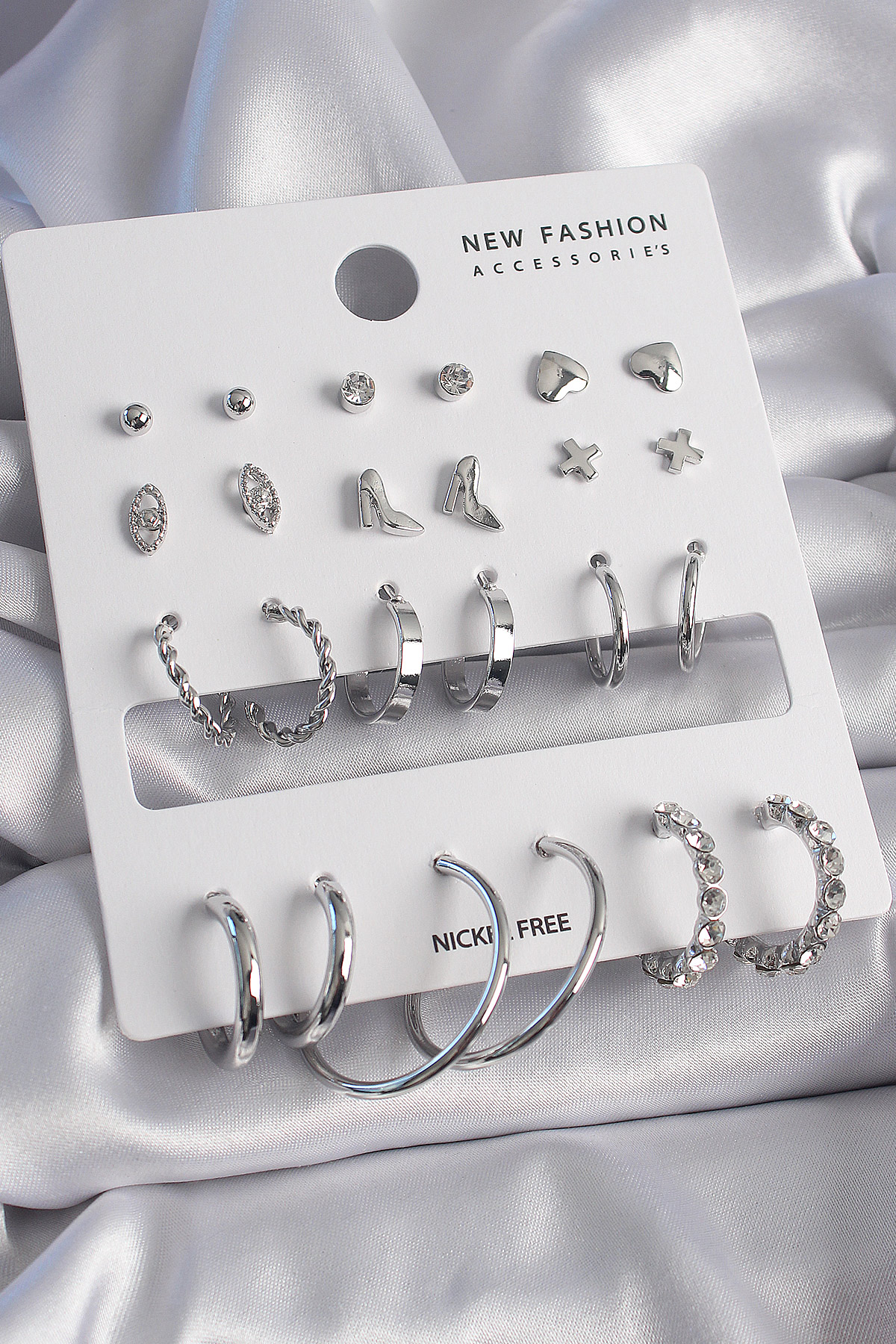 Pirinç Gümüş Renk Zirkon Taş Detaylı 12 Çift Kadın Küpe Seti - TJ-BKP9683