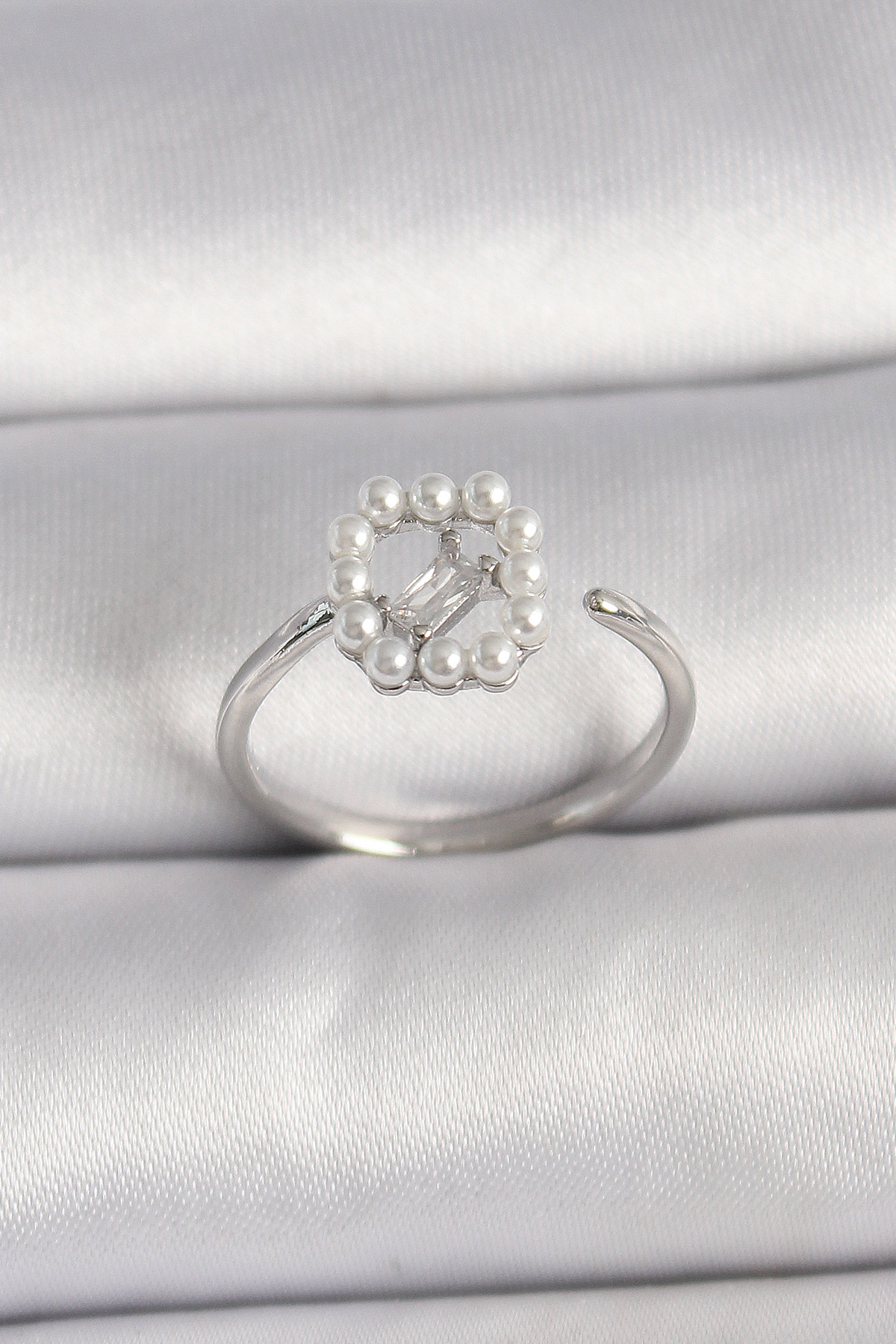 Pirinç Gümüş Renk Zirkon Taş Detaylı İncili Ayarlanabilir Yüzük - TJ-BYK3542