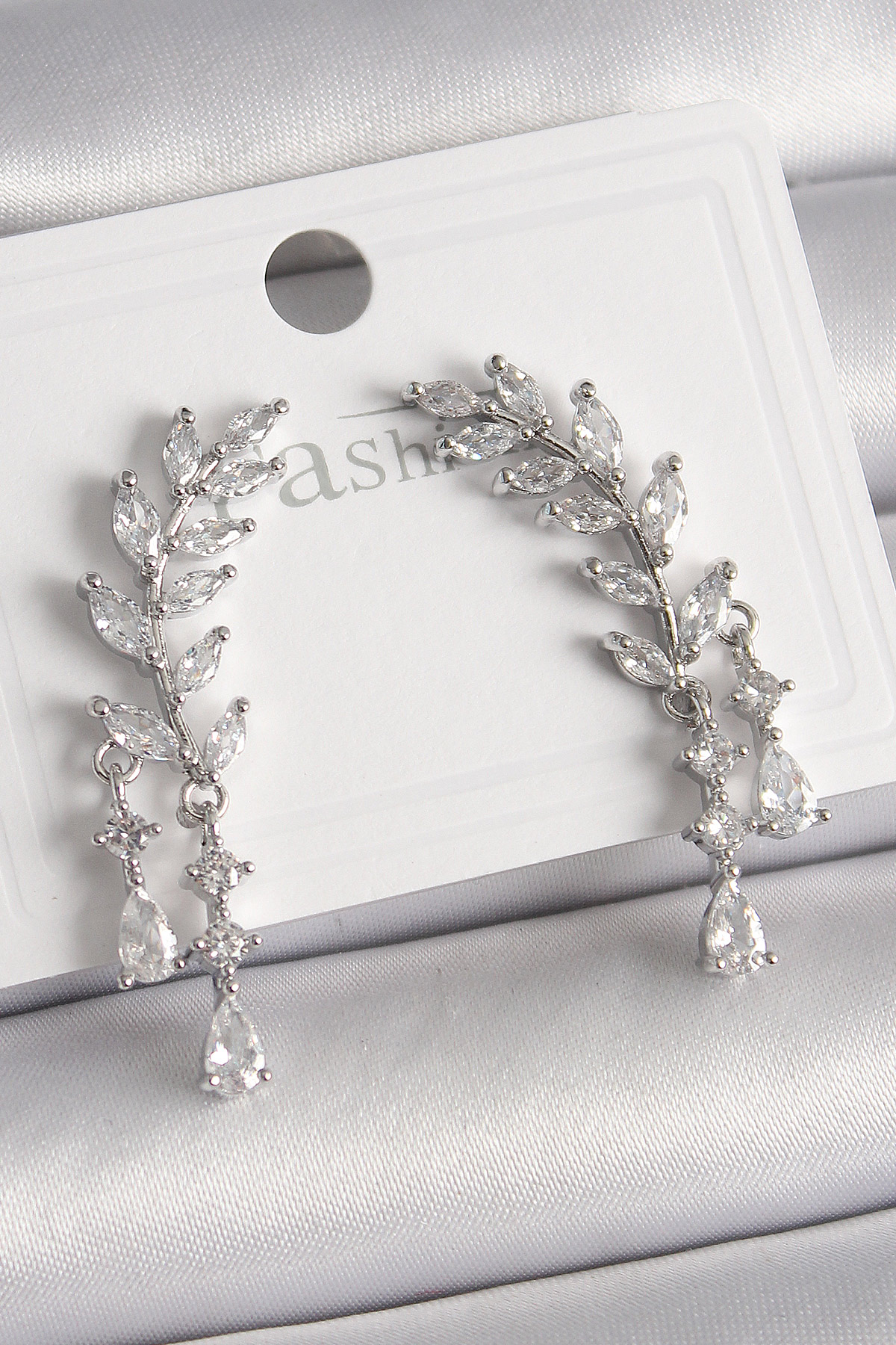 Pirinç Gümüş Renk Zirkon Taşlı Başak Model Kadın Küpe - TJ-BKP9906