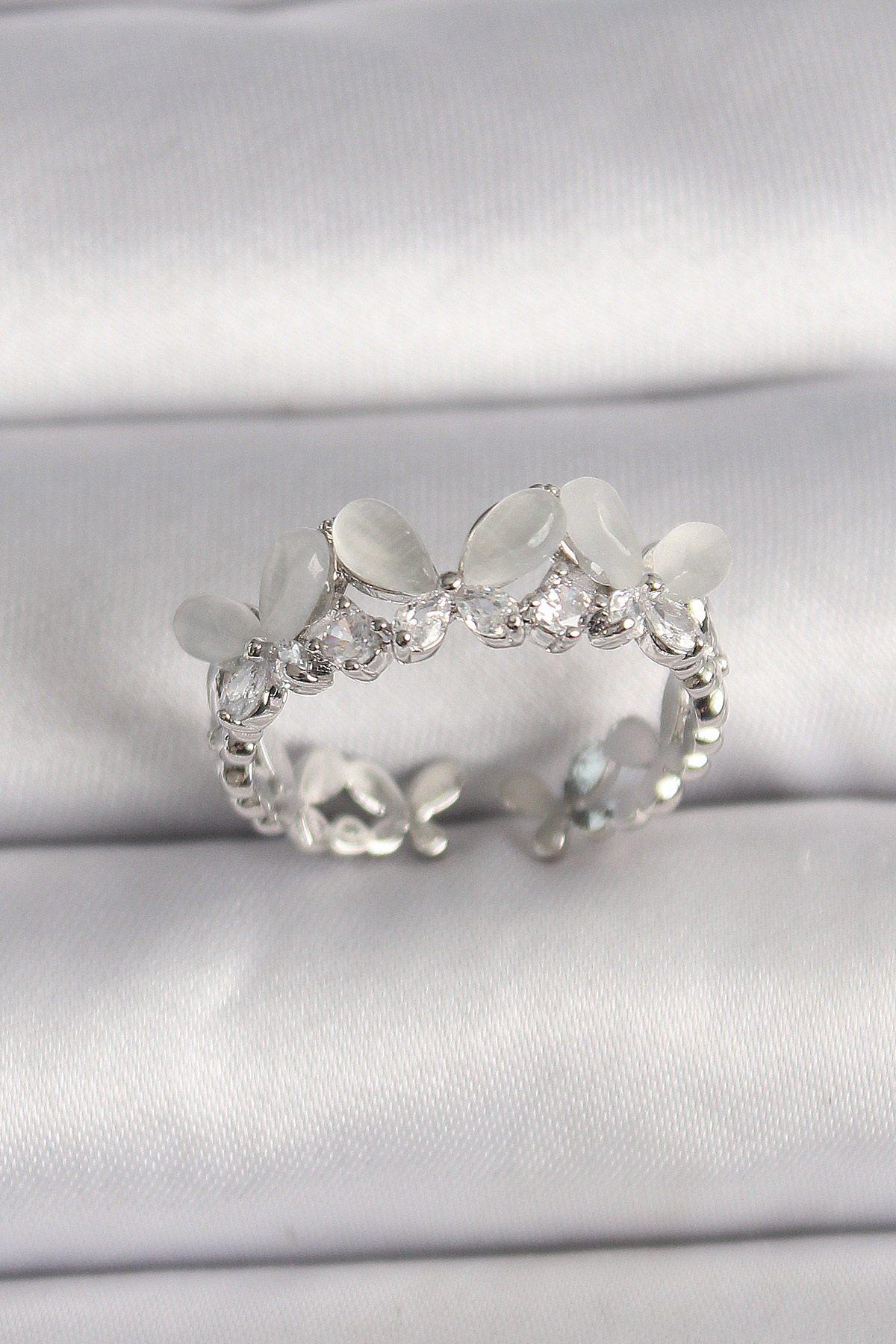 Pirinç Gümüş Renk Zirkon Taşlı Beyaz Mineli Kelebek Model Ayarlanabilir Yüzük - TJ-BYK3530