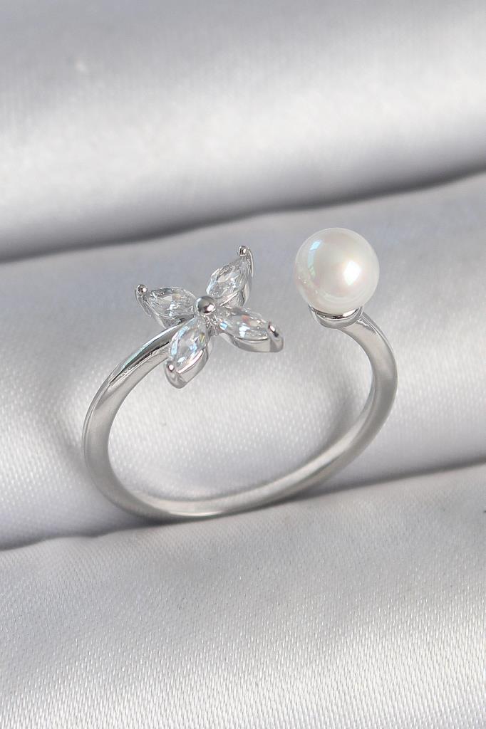 Pirinç Gümüş Renk Zirkon Taşlı Çiçek Model İnci Detay Ayarlanabilir Kadın Yüzük - BYK3726