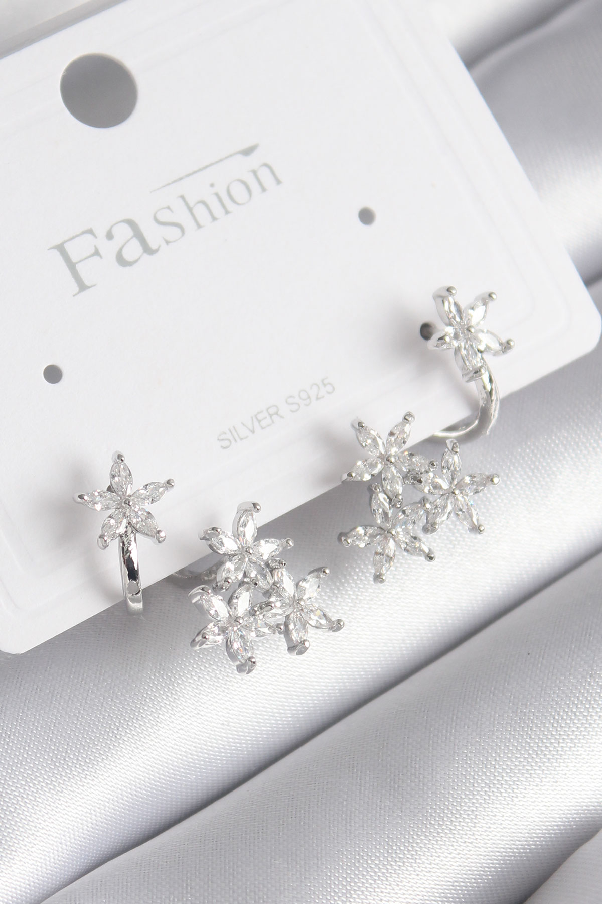 Pirinç Gümüş Renk Zirkon Taşlı Çiçek Tasarım Kadın Küpe - TJ-BKP8606