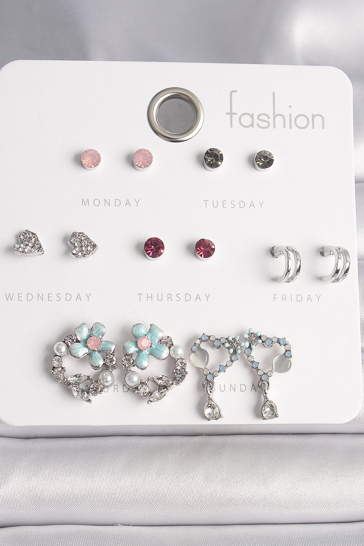 Pirinç Gümüş Renk Zirkon Taşlı Çiçekli Halka Sallantı Detaylı Kalp 7 Çift Kadın Küpe Seti - TJ-BKP10139