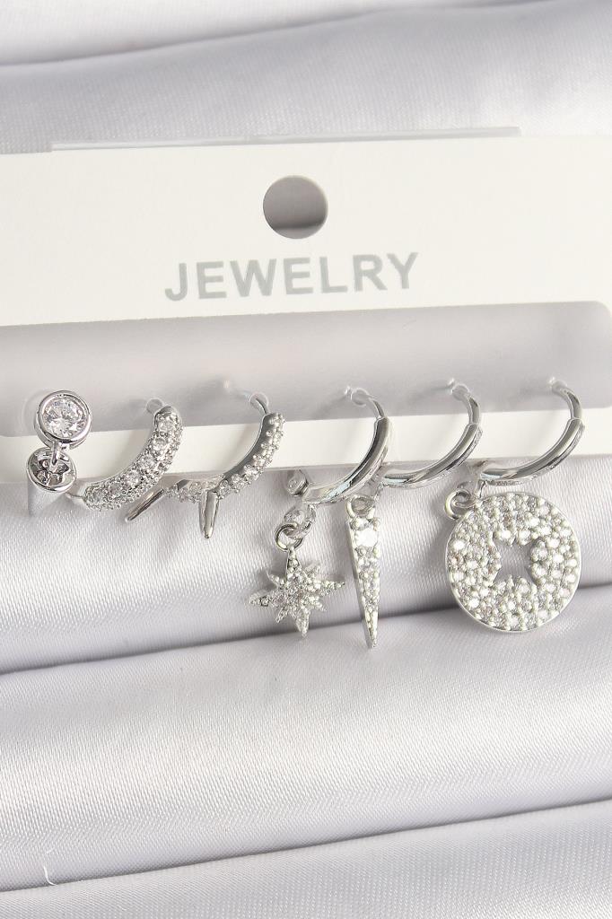 Pirinç Gümüş Renk Zirkon Taşlı Çoklu Figür Kadın Küpe Seti - TJ-BKP10103