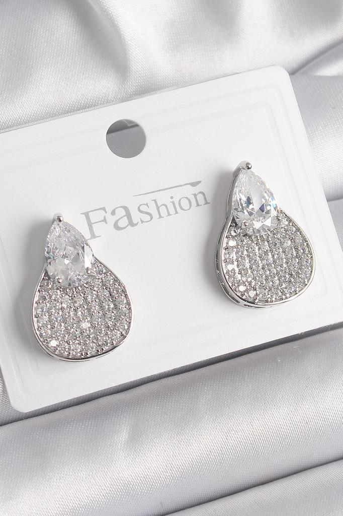Pirinç Gümüş Renk Zirkon Taşlı Damla Model Kadın Küpe - TJ-BKP9871