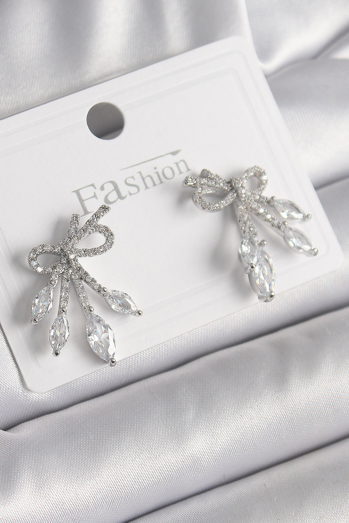 Pirinç Gümüş Renk Zirkon Taşlı Düğüm Model Damla Zirkon Taşlı Kadın Küpe - TJ-BKP9972