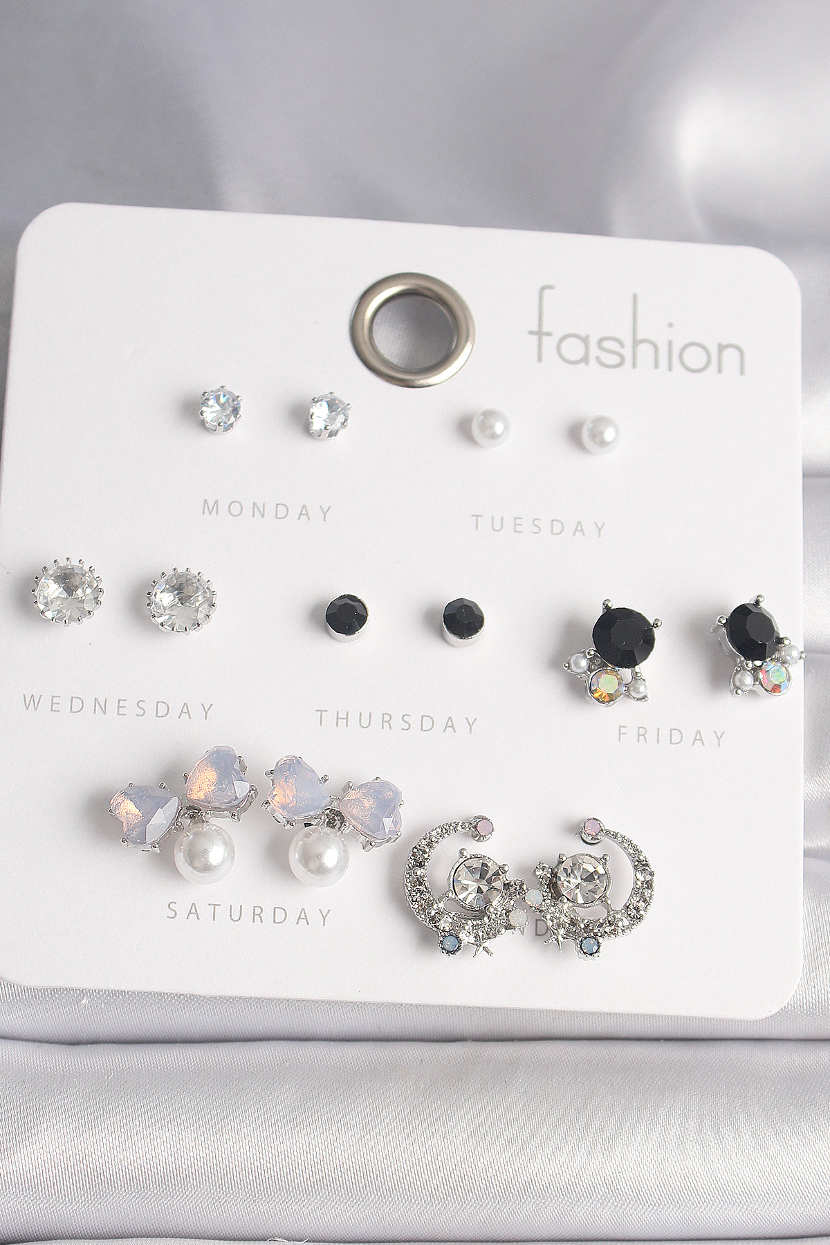 Pirinç Gümüş Renk Zirkon Taşlı Fiyonk Figür İnci Detay 7 Çift Kadın Küpe Seti - TJ-BKP10140